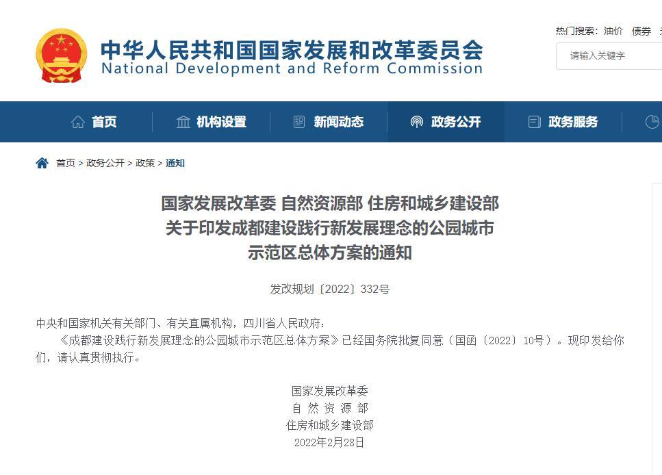 3月16日,川观新闻记者从国家发展和改革委员会官网获悉,《成都建设践行新发展理念的公园城市示范区总体方案》(以下简称《总体方案》)正式发布。该《总体方案》由国家发展改革委、自然资源部、住房和城乡建设部联合印发,明确了目标任务,详细规划了“路线图”,将从国家层面支持成都开展示范区建设各项工作。
