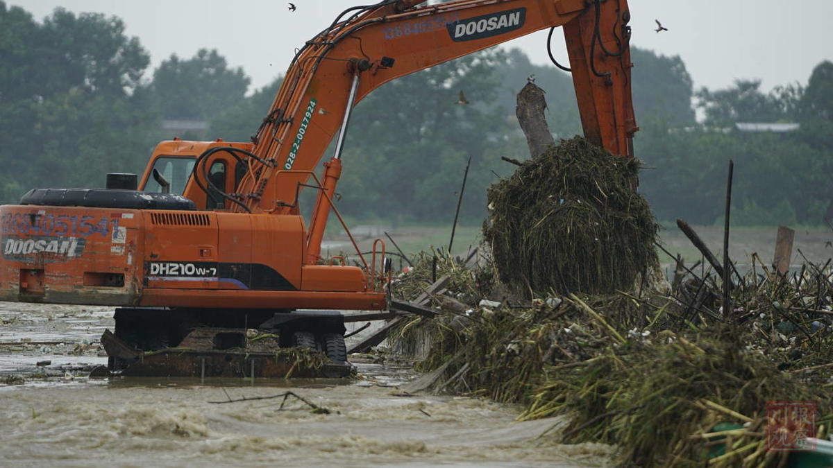 12日中午,一台挖掘机正在鹭丝桥旁清理河面飘浮物,560余名村民全部从白鹭岛转移到安全地点。“大多数投亲靠友,剩下的30余人统一转移到安置点。”