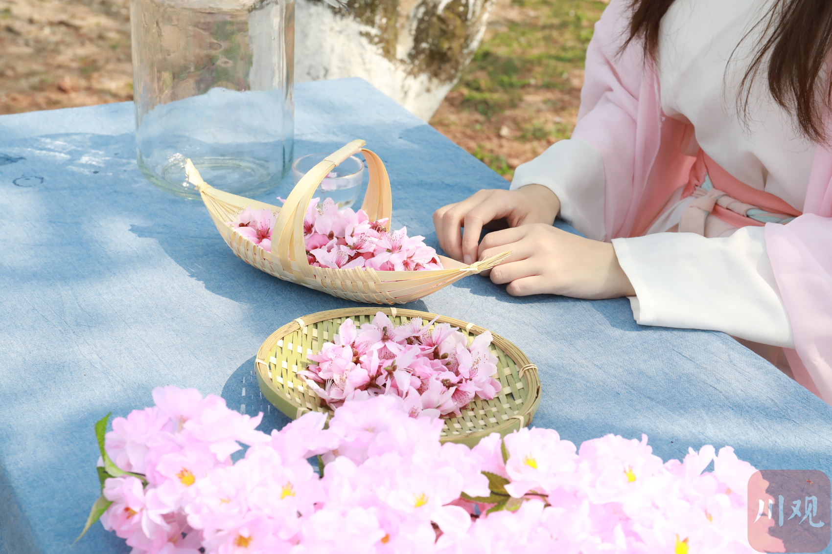 近日,位于四川泸州龙马潭区石洞街道顺江村的桃花竞相绽放,吸引了大量周边游客前来拍照打卡。而作为中国酒城的泸州,用醉人的酒文化,留住这春日的芬芳。来自西南医科大学的学生梅芮晴身着一袭古装,以花做媒酿制桃花酒。景美花香,春日暖阳下,一口桃花酿别有一番滋味。