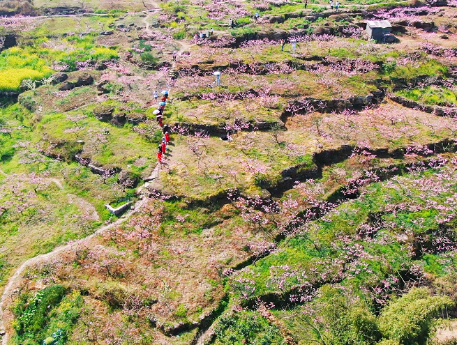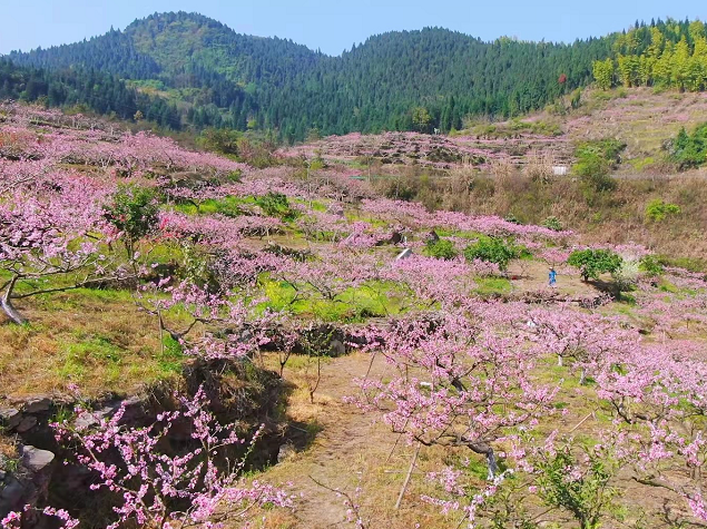 阳春三月,随着气温不断回升。内江威远县新场镇万祥村的皮球桃基地的千亩桃林的桃花迎风绽放,争奇斗艳,绚烂的桃花满山遍野,依山就势把整个山坡变成了一片粉红花海。万祥村的桃花现已进入盛花期,最佳观赏时间将持续至本月20日。