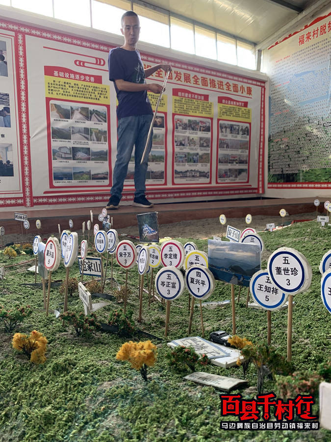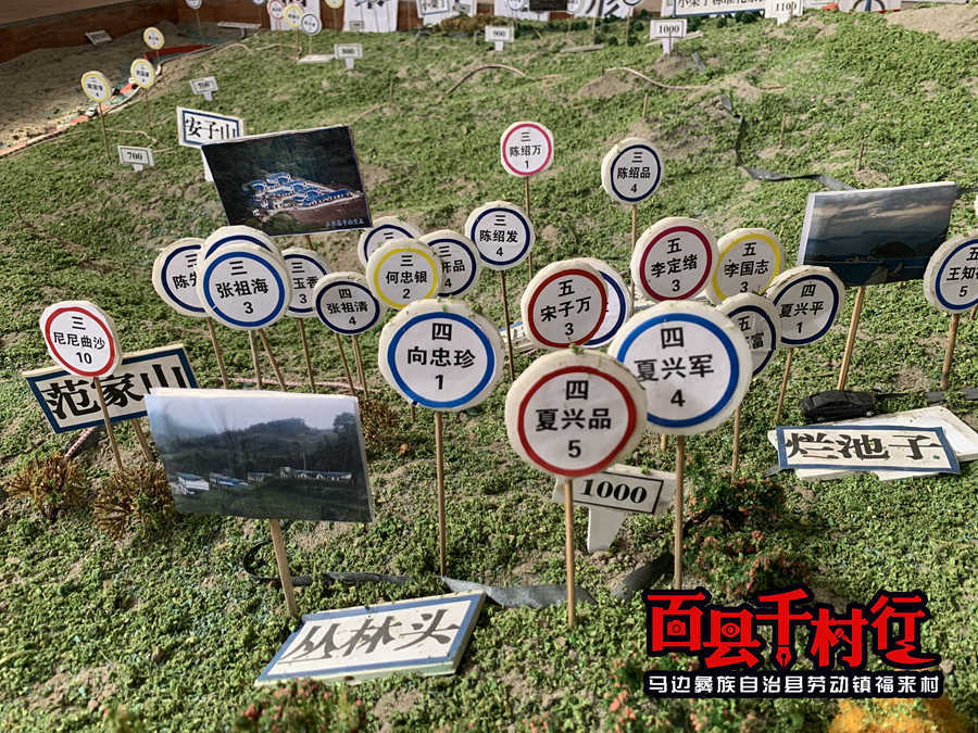 沙盘四米见方,插满了各种形状的图标。“圆形图标代表的是贫困户,不同颜色代表了不同年份的脱贫时间。”劳动镇镇长向勇介绍道,2014年全村精准识别出70户贫困户,全村的贫困户姓名,产业情况,公路等基础设施均在沙盘上进行了标注。