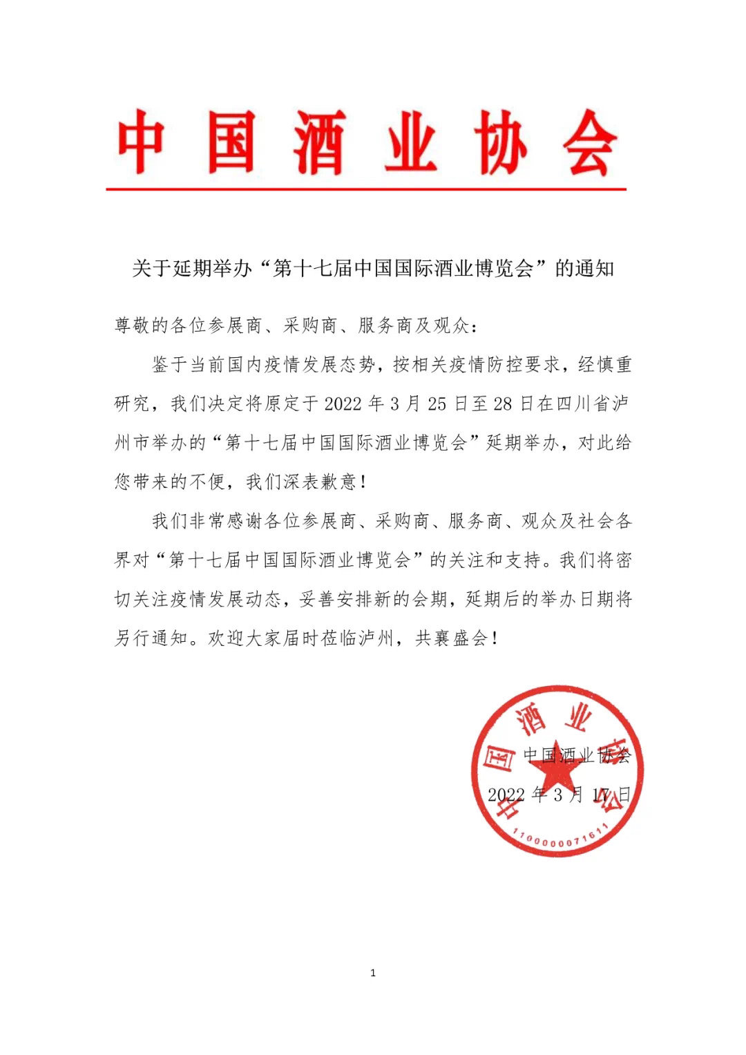 3月17日,川观新闻记者从中国酒业协会获悉,出于疫情防控需要,原定于3月25日至28日在泸州市举办的“第十七届中国国际酒业博览会”(第十七届酒博会)延期。将根据疫情发展动态,妥善安排新的会期,延期后的举办日期将另行通知。