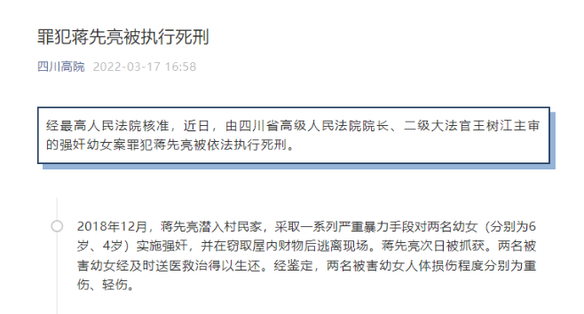3月17日,记者从四川高院获悉,经最高人民法院核准,近日,由四川省高级人民法院院长、二级大法官王树江主审,四川省人民检察院检察长、二级大检察官冯键以检察员身份出庭履行职务的强奸幼女案罪犯蒋先亮被依法执行死刑。