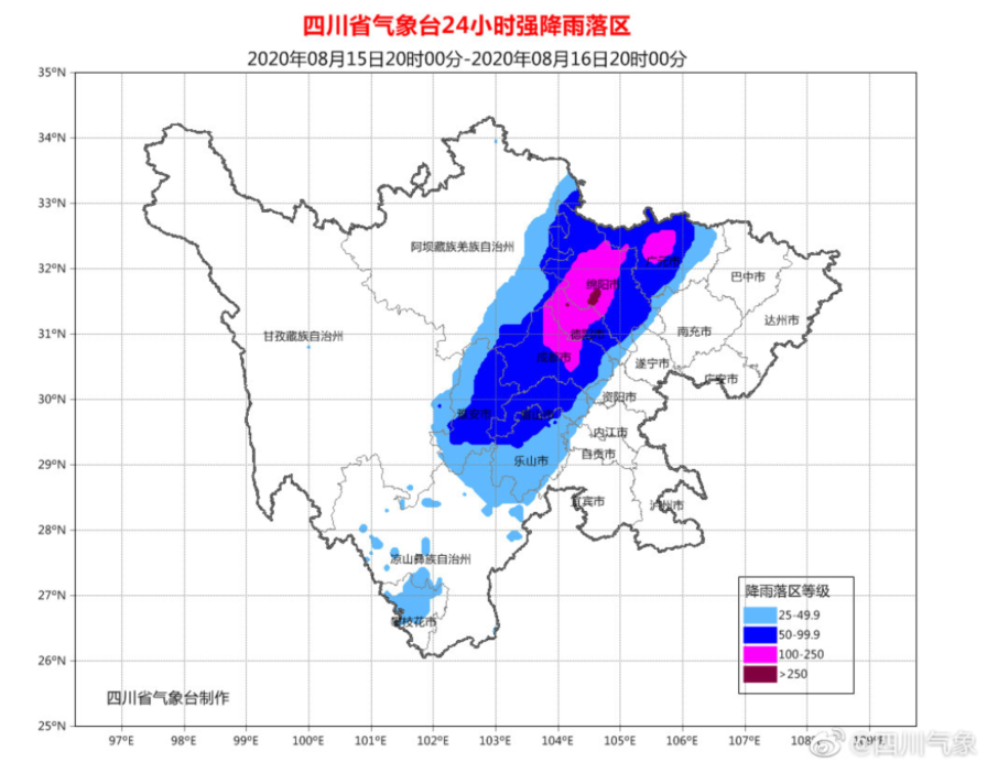 15日20时到16日20时,广元、绵阳、德阳、成都、眉山5市和雅安、乐山2市北部有暴雨(雨量50~80毫米),其中,广元、绵阳、德阳、成都4市的局部地方有大暴雨(雨量120~200毫米),个别地方雨量可达250毫米以上。阿坝州东部(包括漩映地区)有大雨到暴雨(20-50毫米)。