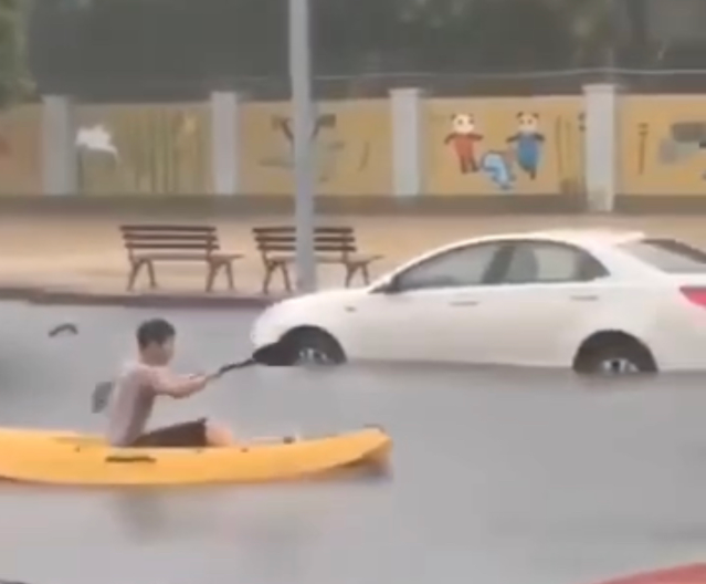 8月16日,成都多地暴雨。网上流传一视频显示,武侯区智障人士托养中心外面的道路被水淹没,有人划着黄色的皮划艇。