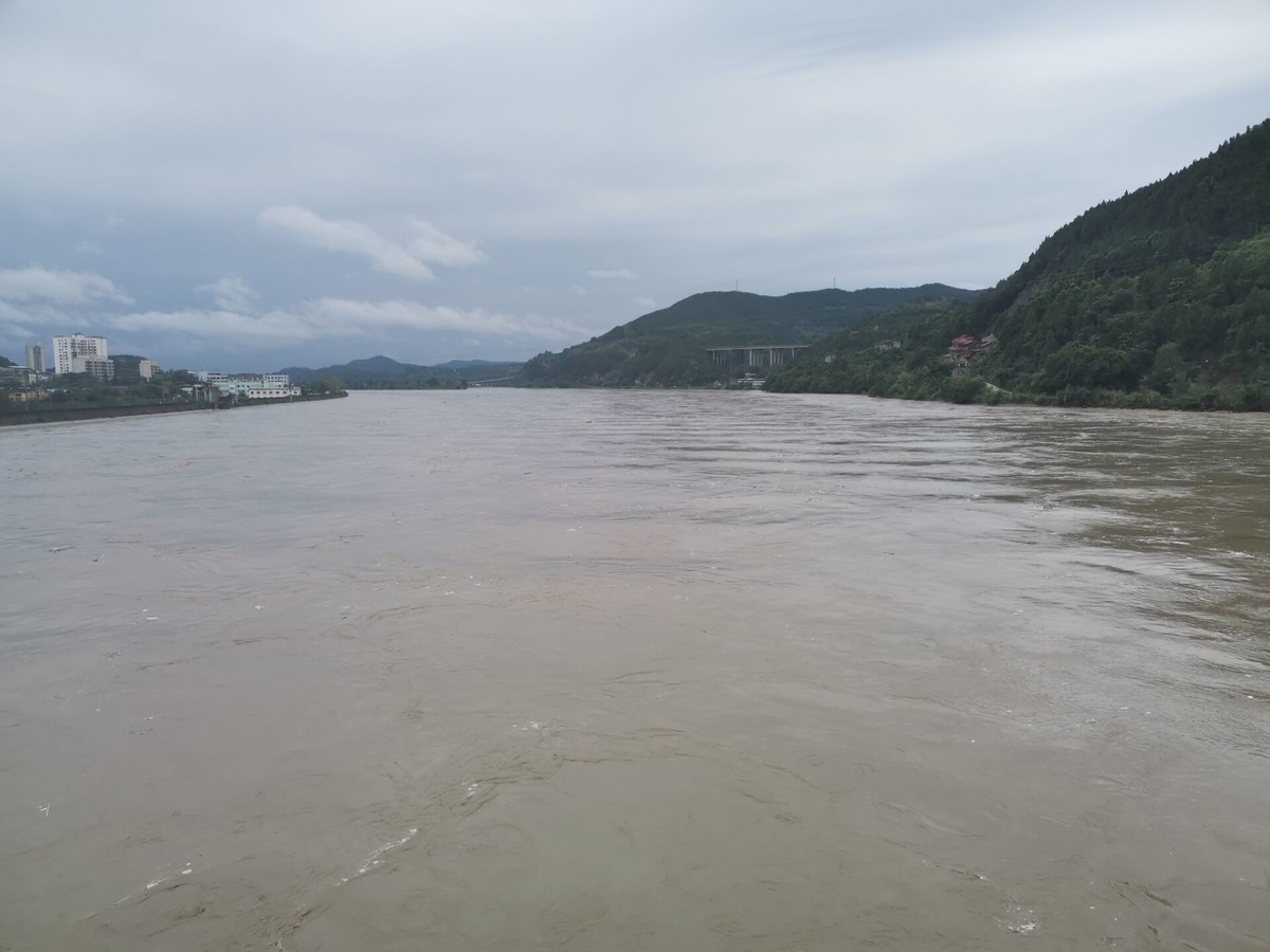 8月16日13时30分,记者在射洪金华镇电航桥,看到涪江水位明显增高,周边农田被水淹过。过水水速很快,站在桥上有眩晕感。