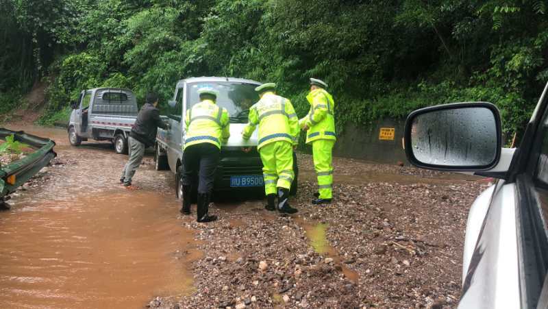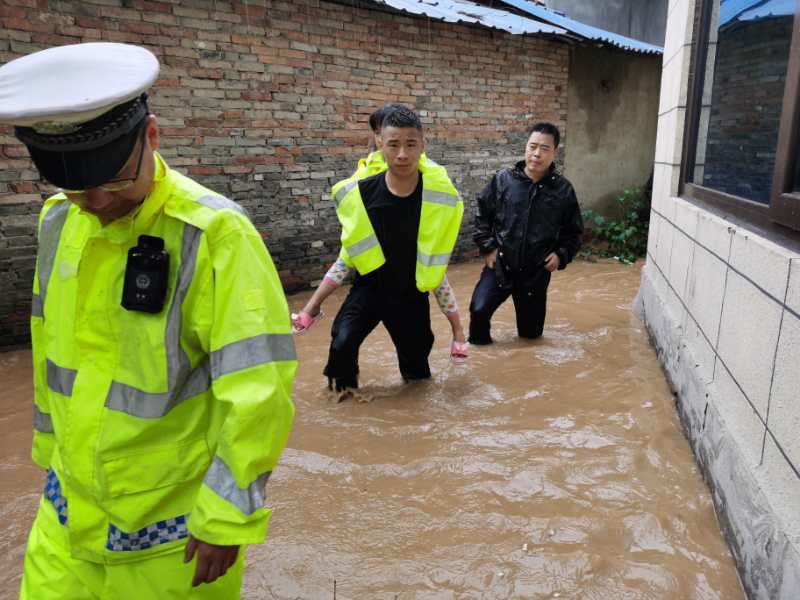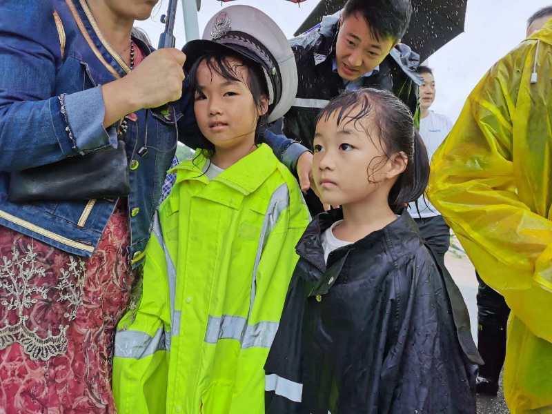 崇州公安交警参与到转移群众工作中。转移人员中有不少儿童,民警连背带抱将他们带离危险区域。还有民警脱下身上的防水外套和大檐警帽,给孩子们穿上,防风挡雨。一名“包裹严实”的小女孩说:“有警察蜀黍在,我一点都不怕!”
