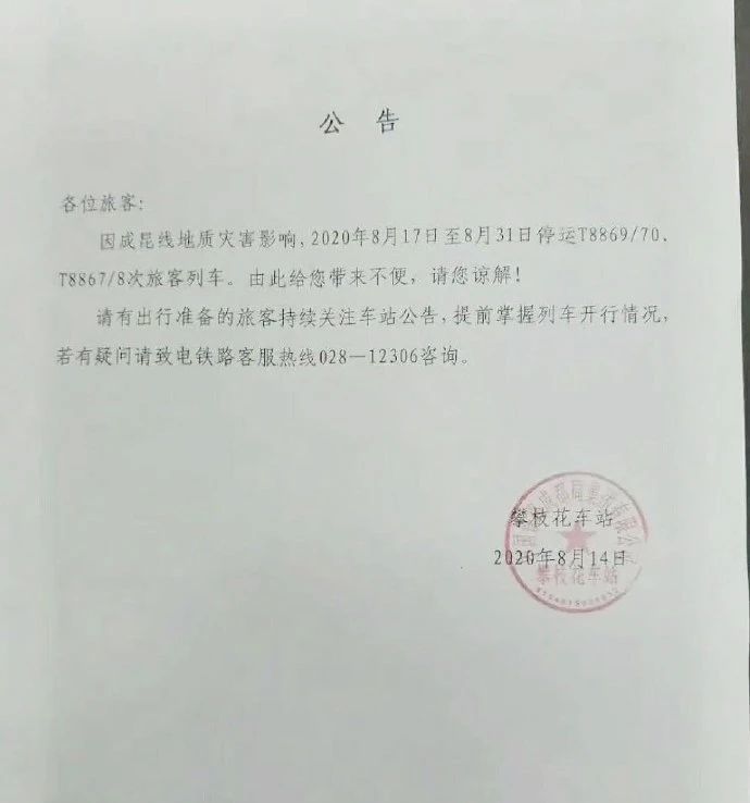 8月16日,记者从攀枝花火车站获悉,因成昆线地质灾害影响,2020年8月17日至8月31日,成都南往返攀枝花的T8869/T8870次、T8867/T8868次旅客列车停运。各位旅客若有疑问请致电铁路客服热线028-12306咨询。