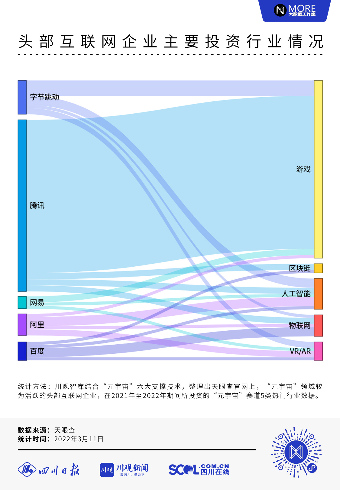 腾讯、字节跳动、阿里、百度和网易等互联网巨头已提前布局。以腾讯为例,川观智库通过分析梳理天眼查平台上元宇宙领域较为活跃的几家头部互联网企业近两年的投资方向发现,2021年以来腾讯参与的公开投资事件中直接投资游戏企业50家、区块链企业1家、人工智能企业2家和物联网企业2家;申请注册名含元宇宙的商标31个(不包括被驳回的商标),主要包括QQ音乐元宇宙、腾讯音乐元宇宙、QQ元宇宙、光子元宇宙、和平精英元宇宙、天美元宇宙、手工星球元宇宙等,商标覆盖腾讯旗下社交、音乐、游戏等多行业。