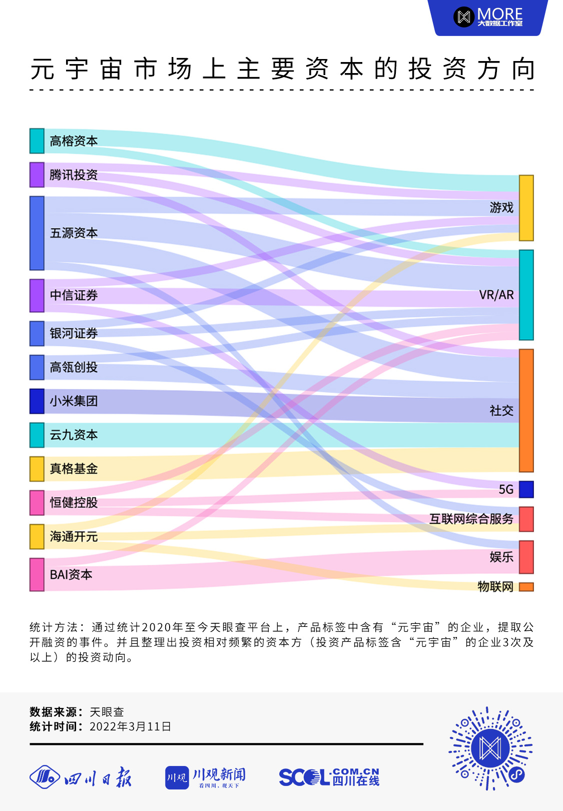 除了互联网巨头,一级市场中,多家头部VC亦重金入场。川观智库梳理天眼查平台产品标签含有元宇宙的企业2020年以来公开融资事件后发现,五源资本、真格基金、高瓴资本等一线投资机构,纷纷入局元宇宙赛道,涉及领域包括社交、娱乐、5G、物联网、游戏、VR/AR以及互联网综合服务等。其中五源资本动作最为频繁,涉及领域较广,几乎遍布元宇宙赛道热门领域。2022年以来,连续投资做游戏AI项目的超参数科技(深圳)有限公司,VR/AR行业的元象唯思控股(深圳)有限公司和上海唯二网络科技有限公司。