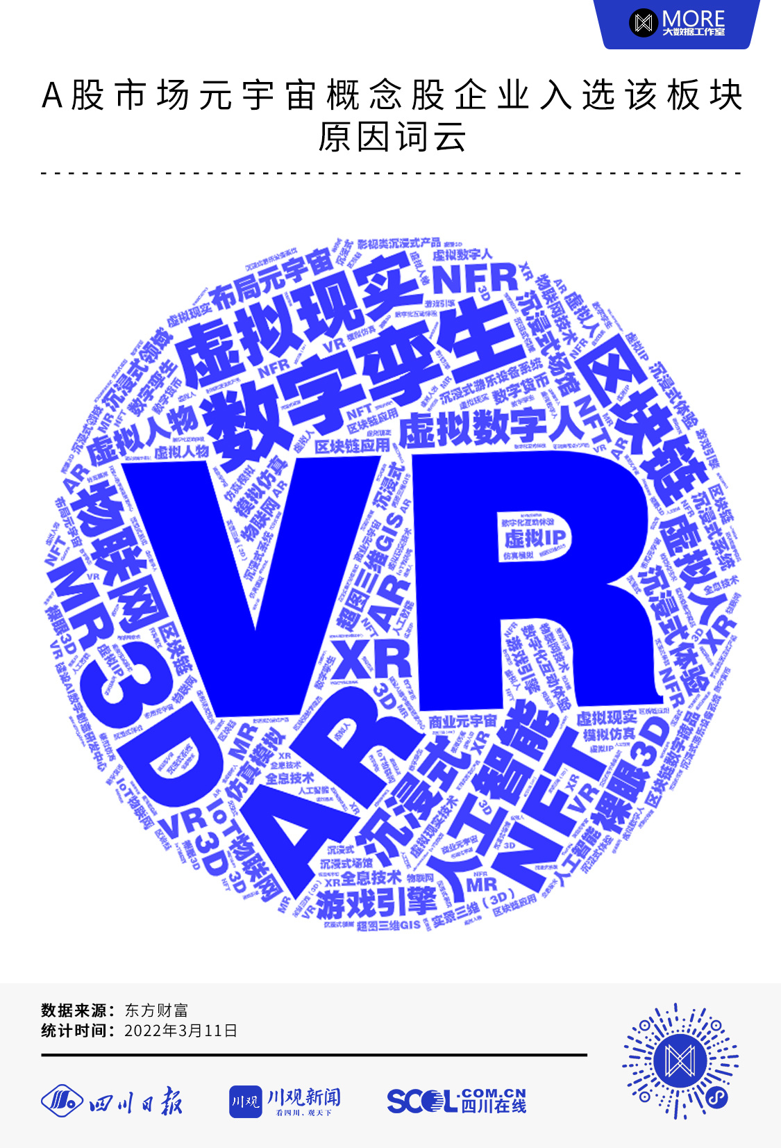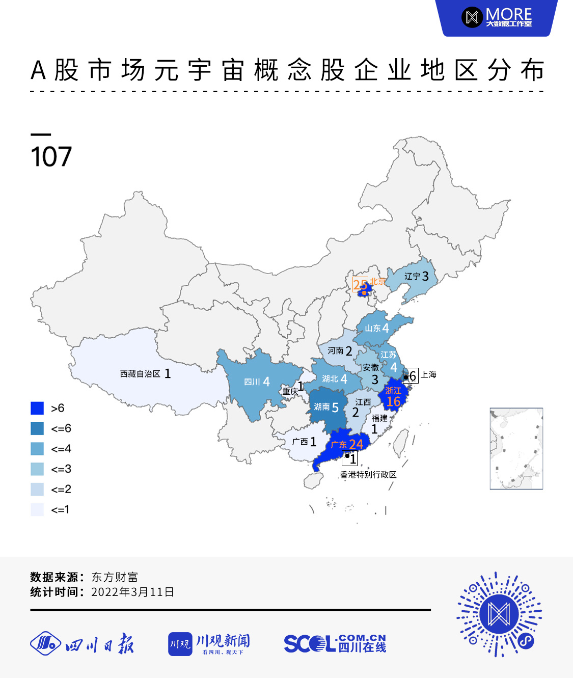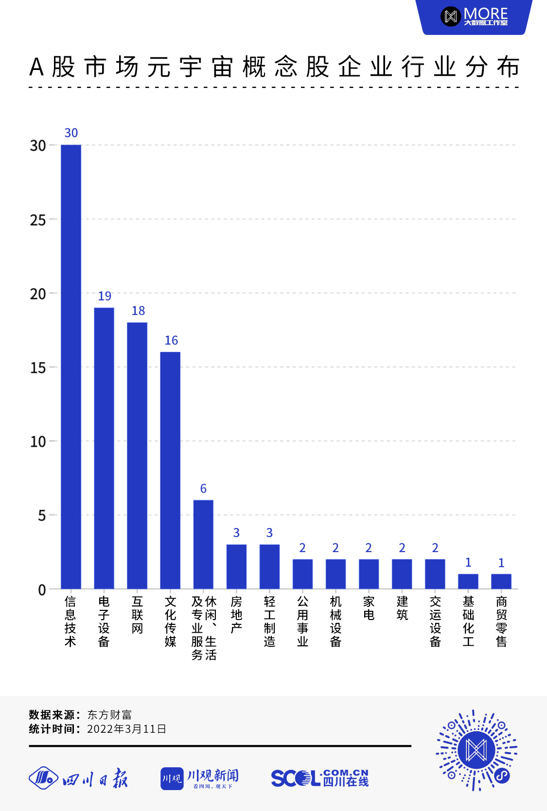 除了头部互联网企业和投资方外,A股市场元宇宙概念股也热闹非凡。川观智库调研发现,截至2022年3月11日,共计107家企业入驻A股元宇宙概念板,进行数据画像后发现以下三个特点: