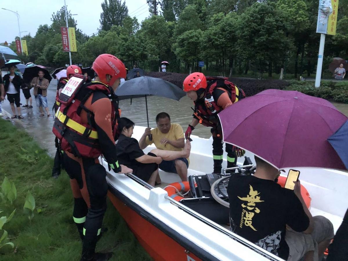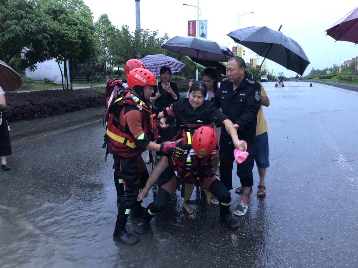 19时50分,一名在蜀森豪丽就餐的老人因右腿被划伤,需立即就医,现场消防员立即行动,一名队员背起老人,将老人送至冲锋舟安顿好,冲锋舟立即将老人送至安全区域,并嘱咐老人立即就医。