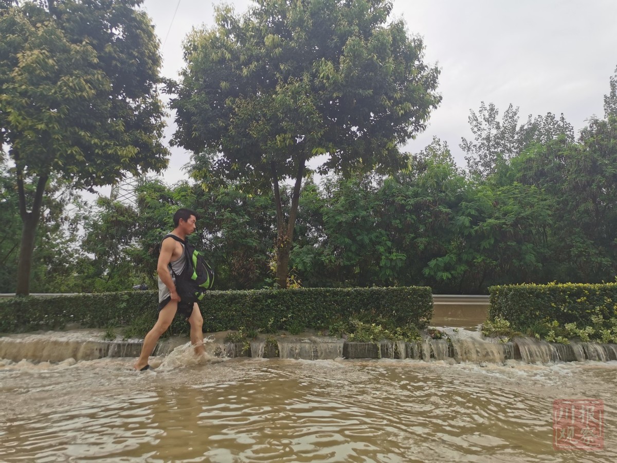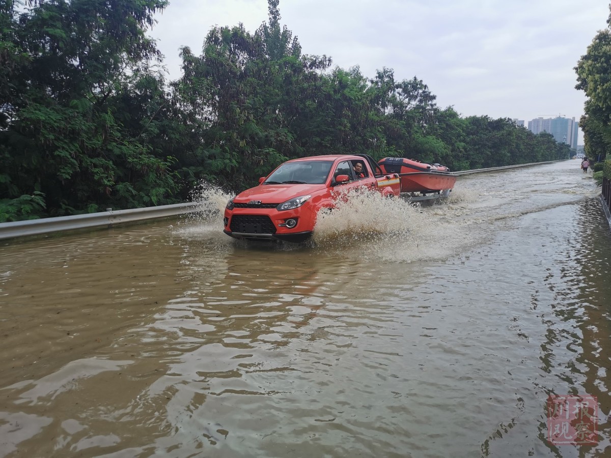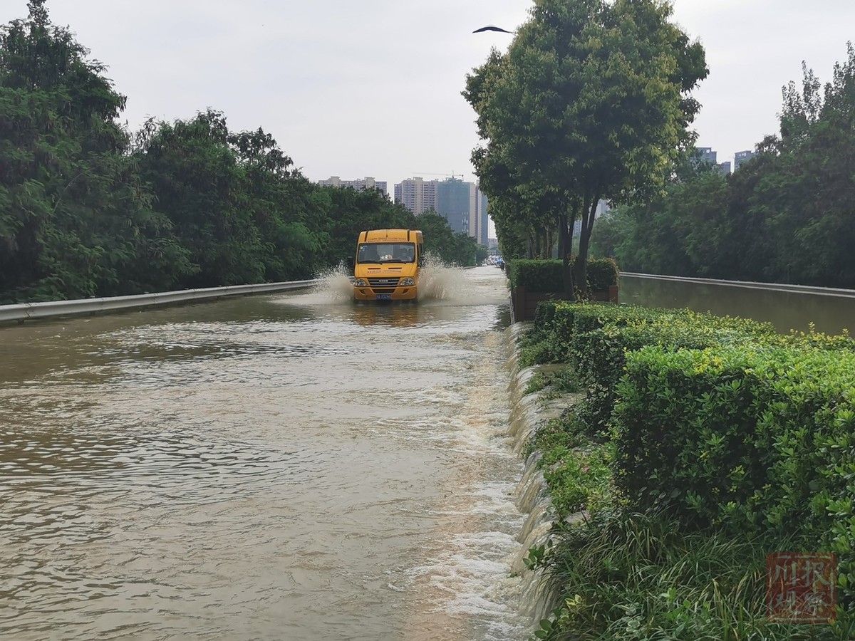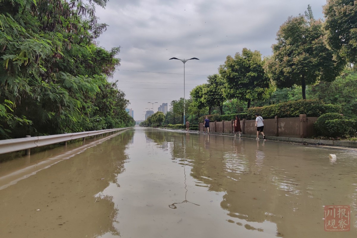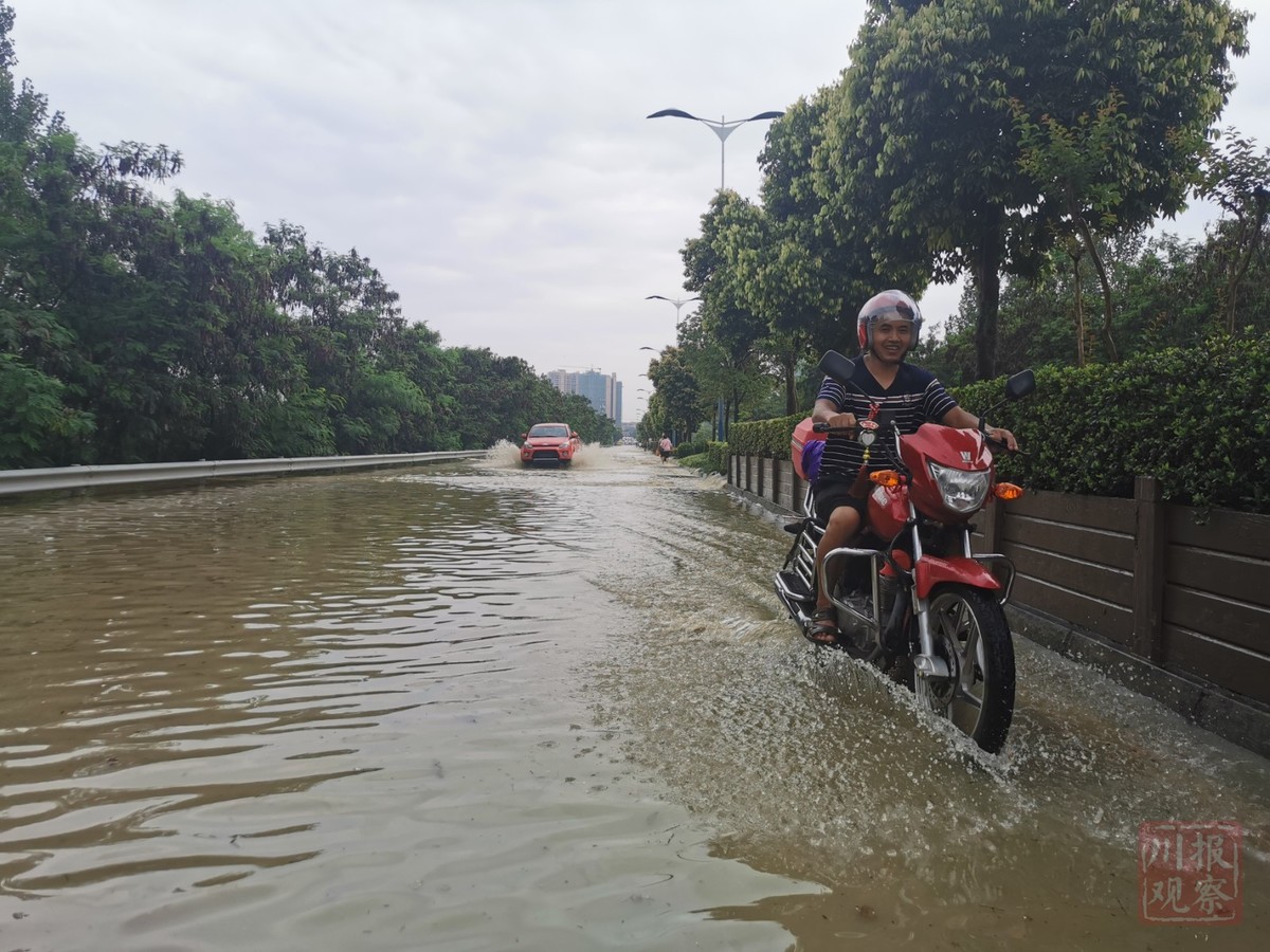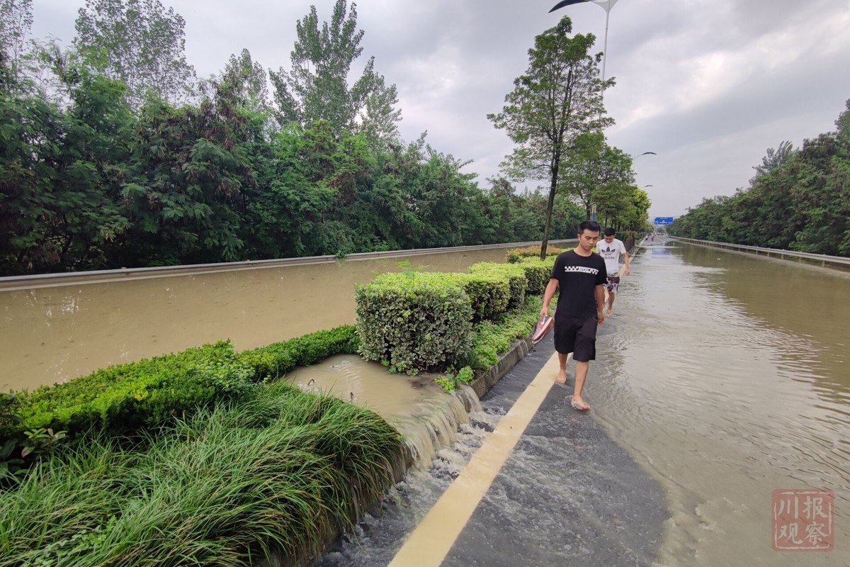8月17日,川报观察记者在前往金堂县采访时发现,成南路部分路段积水较深,部分地方积水已经达到路边护栏下沿,目测有40公分左右,小型车辆无法通行。