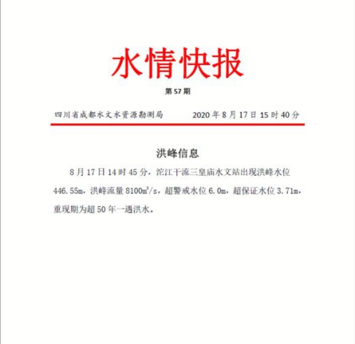 8月17日,记者从四川省成都水文水资源勘测局获悉,8月17日14时45分,沱江干流三皇庙水文站出现洪峰水位446. 55米,洪峰流量8100立方米/秒,超警戒水位6. 0m,超保证水位3. 71米,重现期为超50年一遇。
