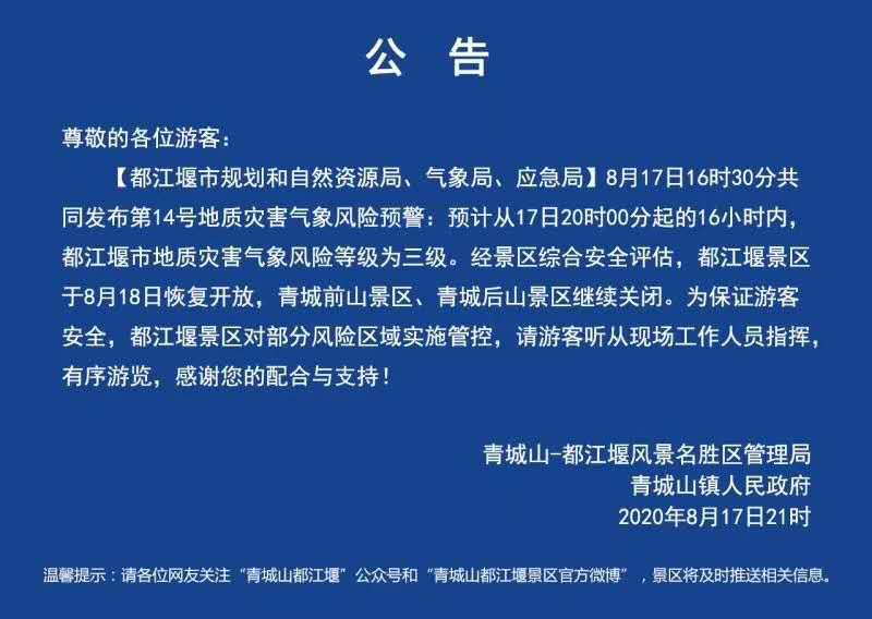 8月17日21时,青城山-都江堰风景名胜区管理局、青城山镇人民政府发布公告,根据都江堰市规划和自然资源局、气象局、应急局于8月17日16时30分发布的第14号地质灾害气象风险预警:预计从17日20时00分起的16个小时内,都江堰市地质灾害气象风险等级为三级。经景区综合安全评估,都江堰景区于8月18日恢复开放,青城前山、后山景区继续关闭。