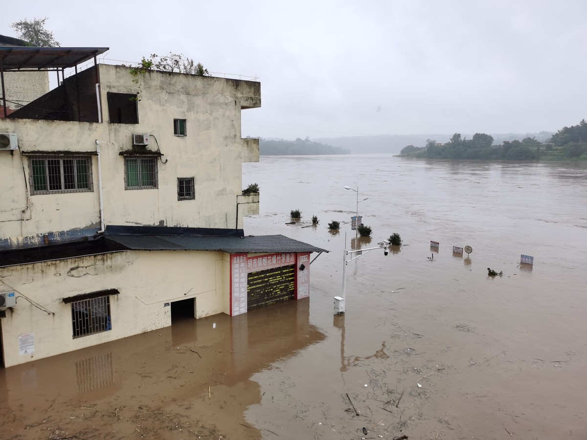 记者在现场看到,胡市镇滨河广场已被淹没,只剩半截路灯和宣传栏顶部露出水面。江水涨了一层楼高,水已涨到沿江一排门市的门拱边缘。