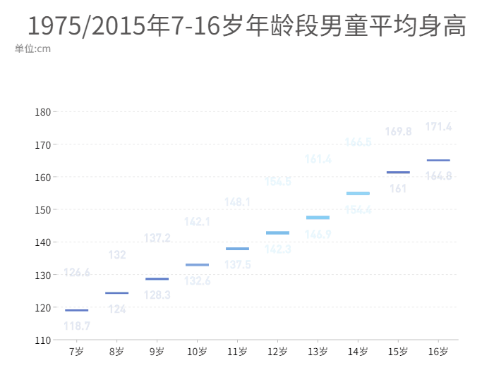 不同年份,不同年龄段,男孩女孩的平均身高也不尽相同,所以,你的孩子没必要跟他的哥哥姐姐当时年龄的身高比较,也没必要和周围不同性别的孩子比较。单看2015年,7岁男孩的平均身高为127cm,12岁男孩为155cm,16岁男孩为171cm。