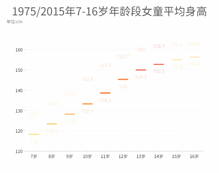 2015年,7岁女孩的平均身高为125cm,12岁女孩为154cm,16岁女孩为160cm。
