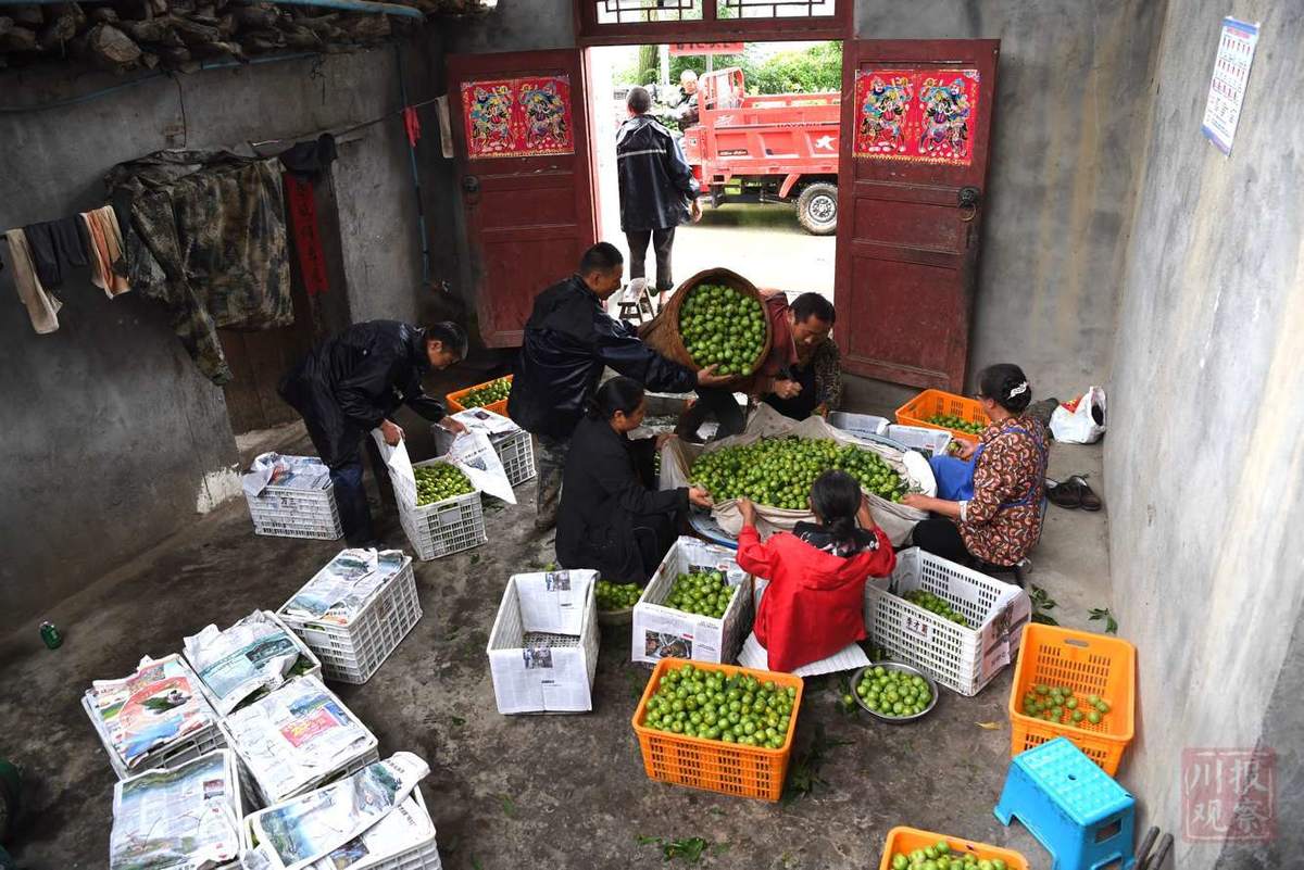 第一批摘下的李子从林后送到杨家屋里,几个妇女已等候在此,人工将李子分级装箱。天一亮,广安水果收购商范超站在杨家门口开始检查水果品质,并帮着装箱过秤。一批又一批李子送下来,不仅有杨家的李子,还有村上其他人户的。范超说,他已在村上待了5天,每天收齐5吨发一趟车。青脆李从树上摘下,到广安销售不超过24小时,新鲜得很,“别的水果我卖不赢别人,卖佳山青脆李我有信心。”