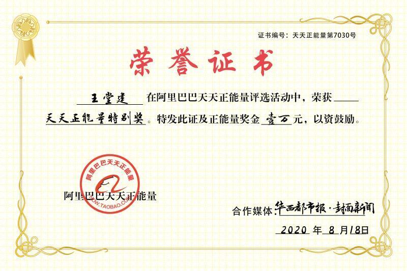 事情发生后,王堂建的救人行为刷屏遂宁朋友圈,不少网友给他点赞“中国好老板”,阿里巴巴天天正能量平台也因此授予他“天天正能量特别奖”,以及10000元正能量奖金。