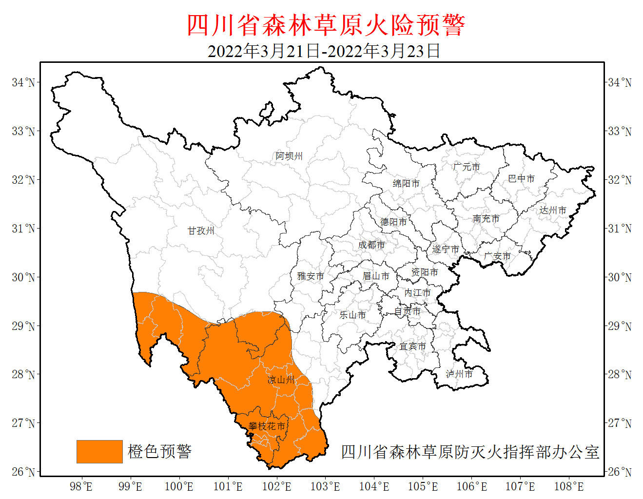 经省森防指办公室与省林草局、省气象局,攀枝花市、甘孜州及凉山州森防指办公室综合会商,研判气象条件、林区物候、野外火源及火灾发生情况,预计3月21日-23日上述地区森林草原火险等级将维持在高度危险级别,防火形势十分严峻,特发布高森林草原火险橙色预警。