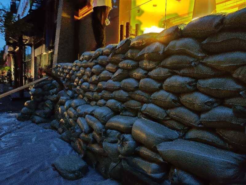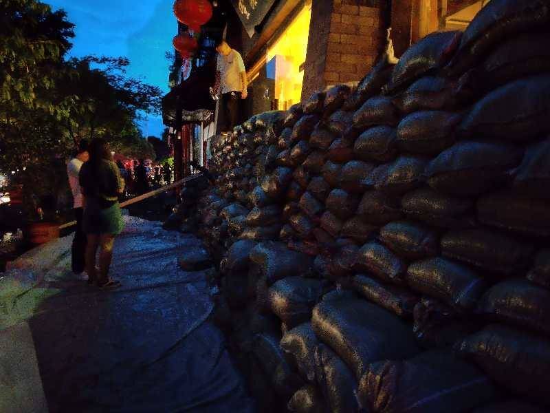 记者到现场时,该茶行门前的沙袋已堆起1.7余米,据文先生介绍,预计要砌2米的沙墙,目前看来大概能砌到1.8米。