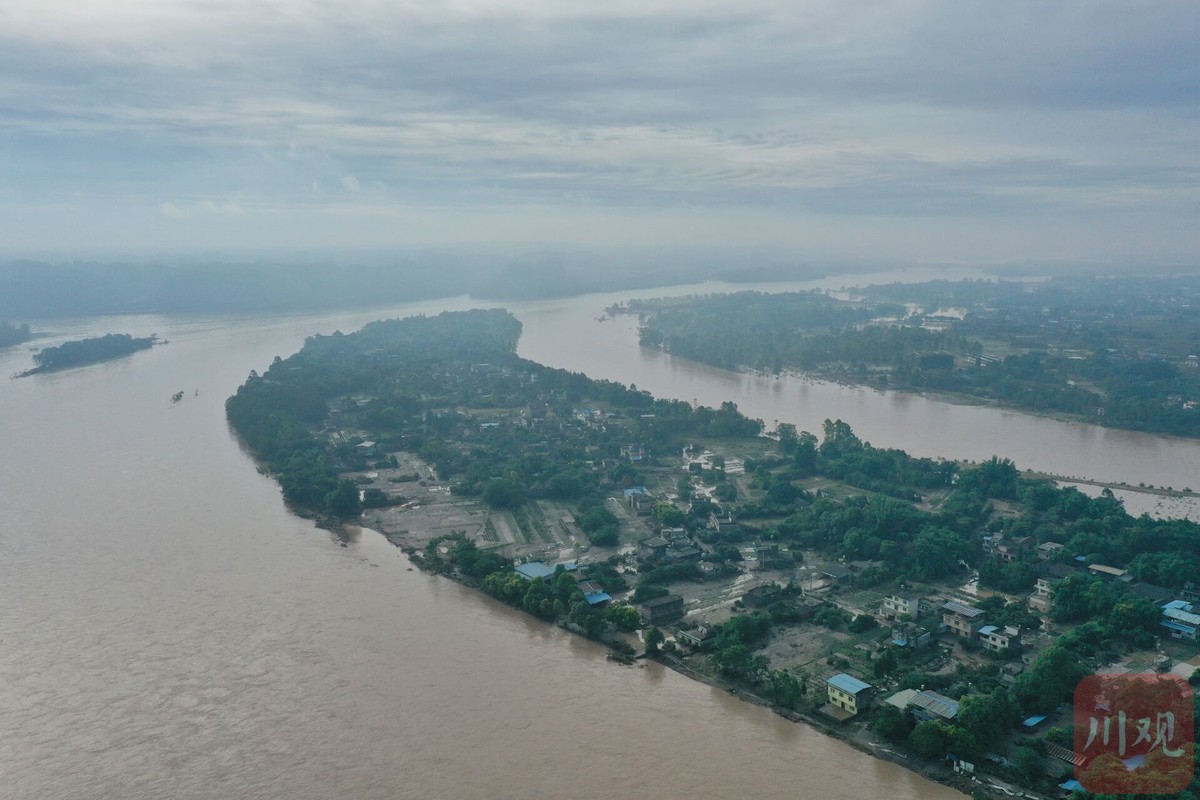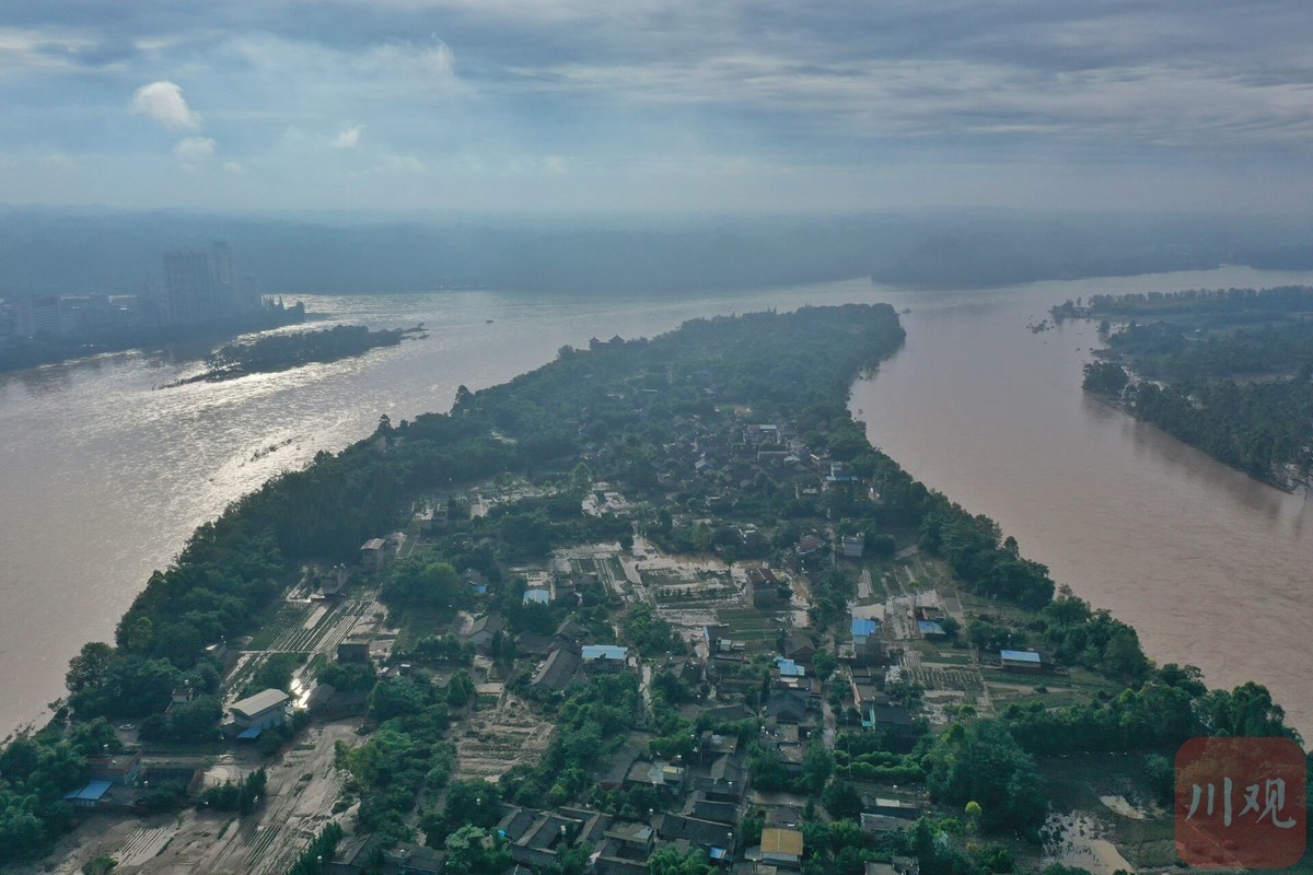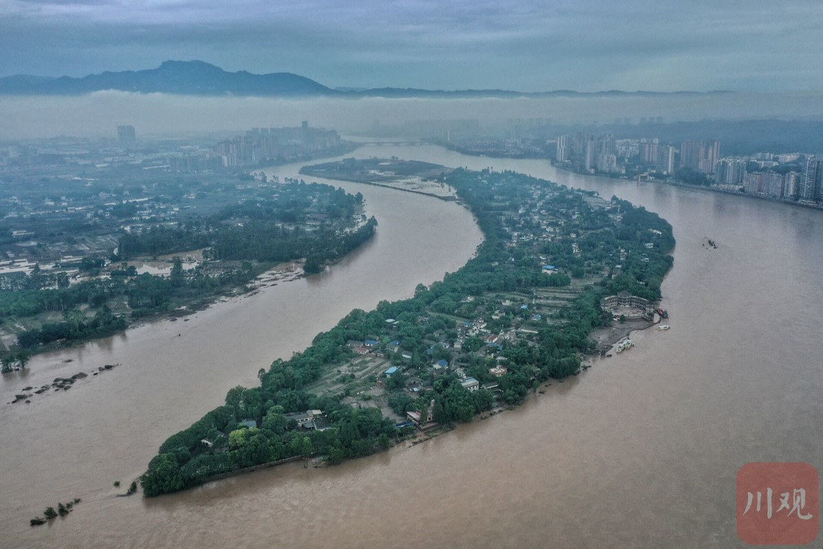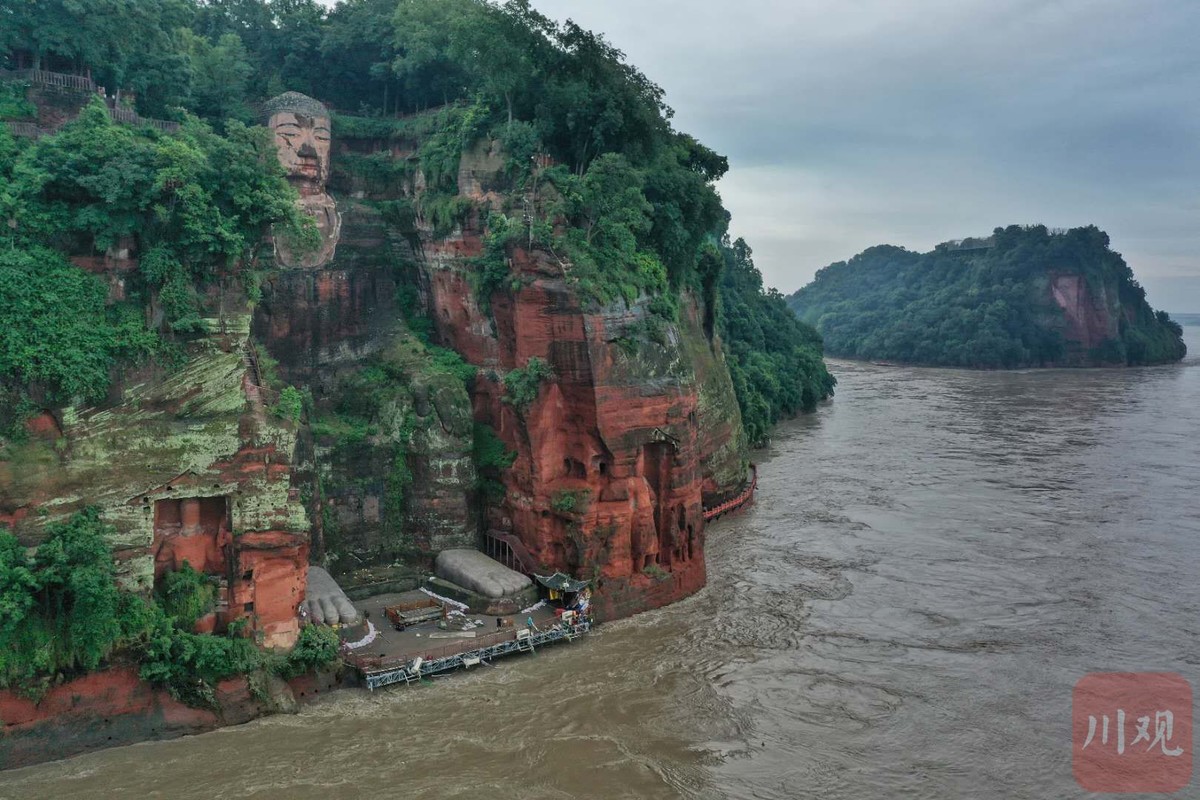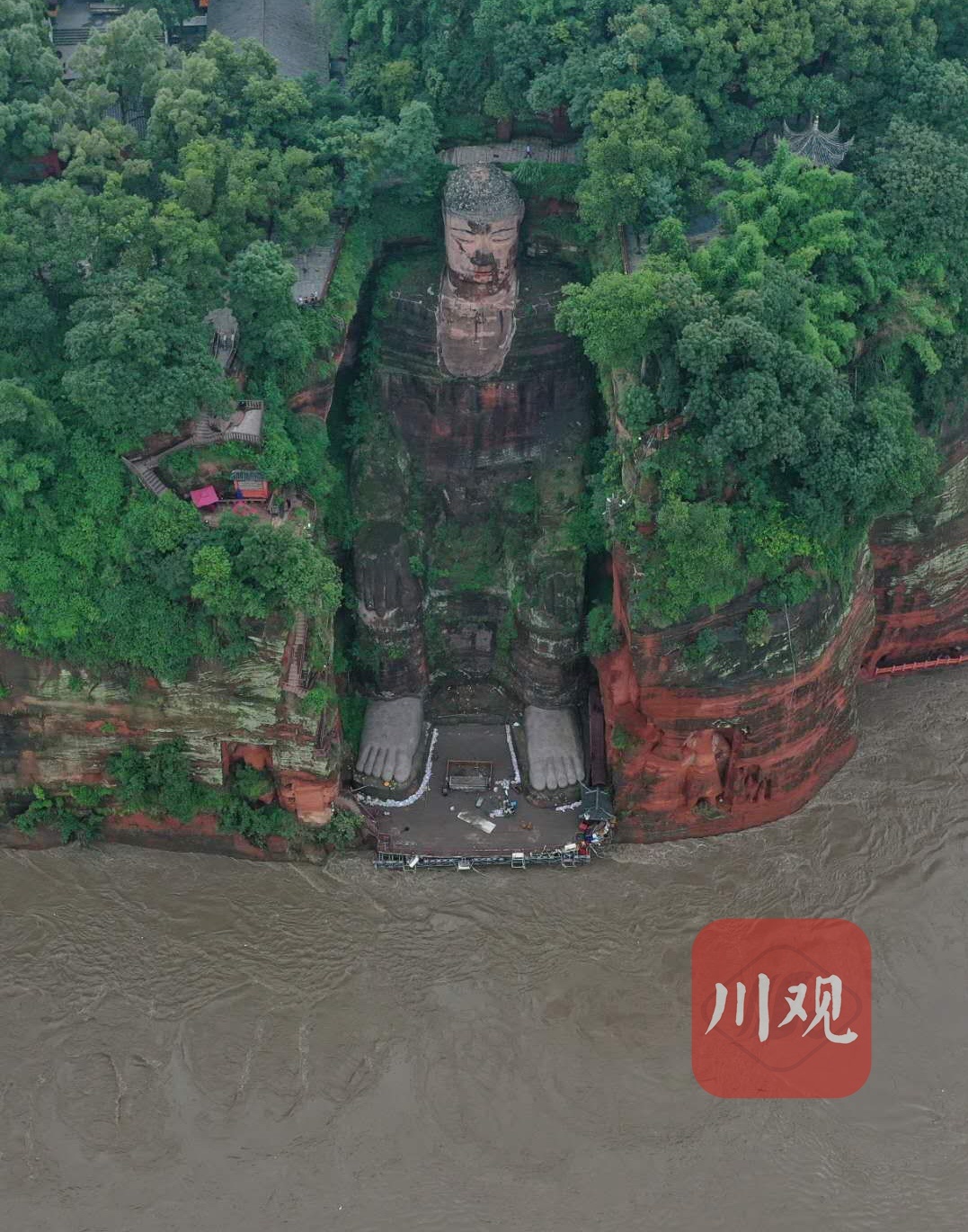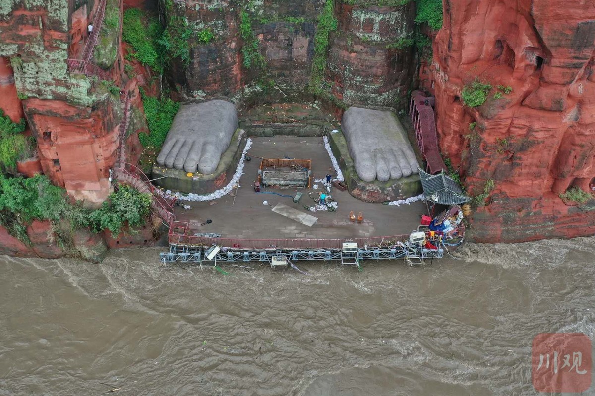8月19日上午8点30分,记者通过空中影像看到,乐山大佛的脚趾已经露出来了,水位已退至佛脚平台以下。一江之隔的凤洲岛水位也已退下。