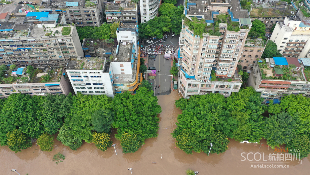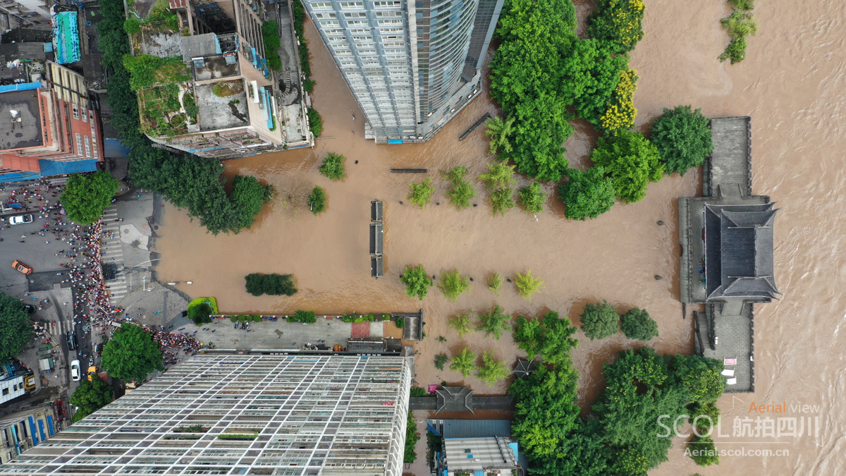 9时左右,航拍四川签约飞手在现场观察到水位还在上涨。通过10时许拍摄下的航拍画面可以看到,滨江路沿线的洪水仍继续向城市内蔓延。警戒线内,不少市民注视着洪水过境,等待洪水消退。