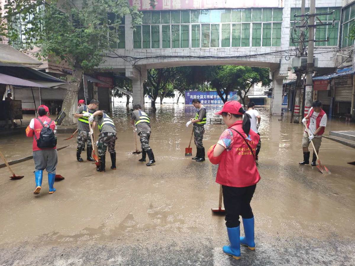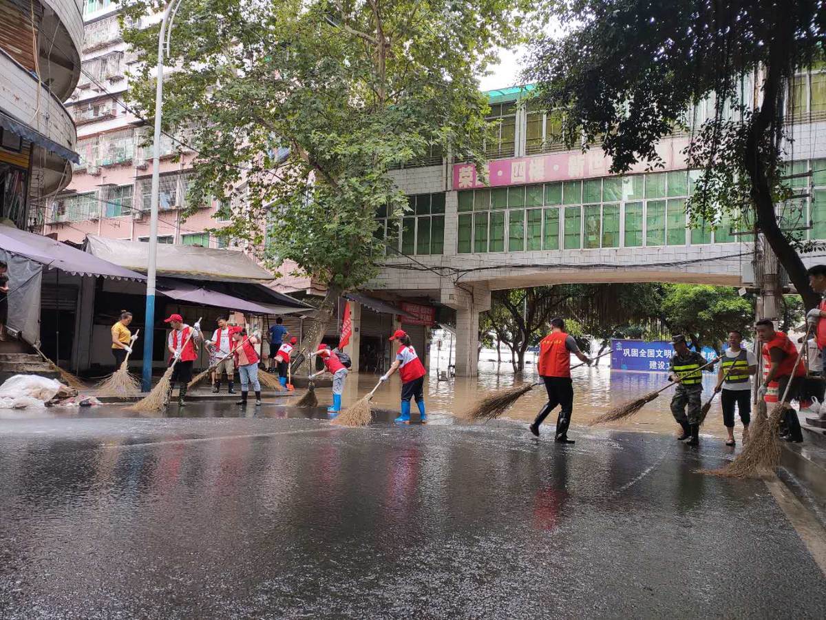 下午3:00,泸州市龙马潭区小市街道合道街,几十位由民兵、环卫工人、社区工作人员组成的清淤队伍正在用扫帚扫水,一旁的环卫车正在洒水助力冲洗淤泥。