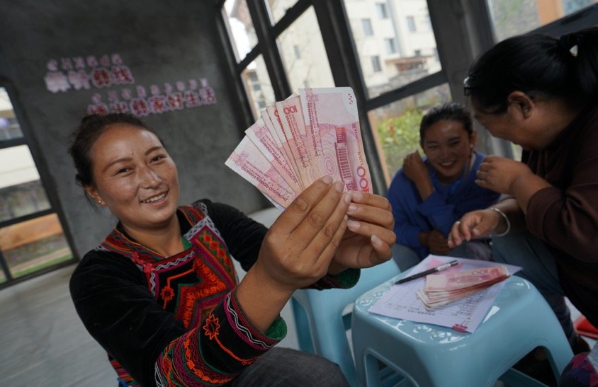 28岁的古比金来莫以前住在山上,每天不是带孩子就是在田里种地。现在,她靠着在社区彝绣培训班2个月的集中培训,领到了人生第一笔“工资”。