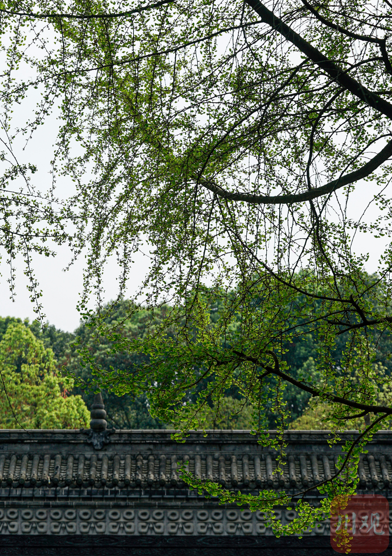 杜甫草堂博物馆外的银杏树长出绿叶。