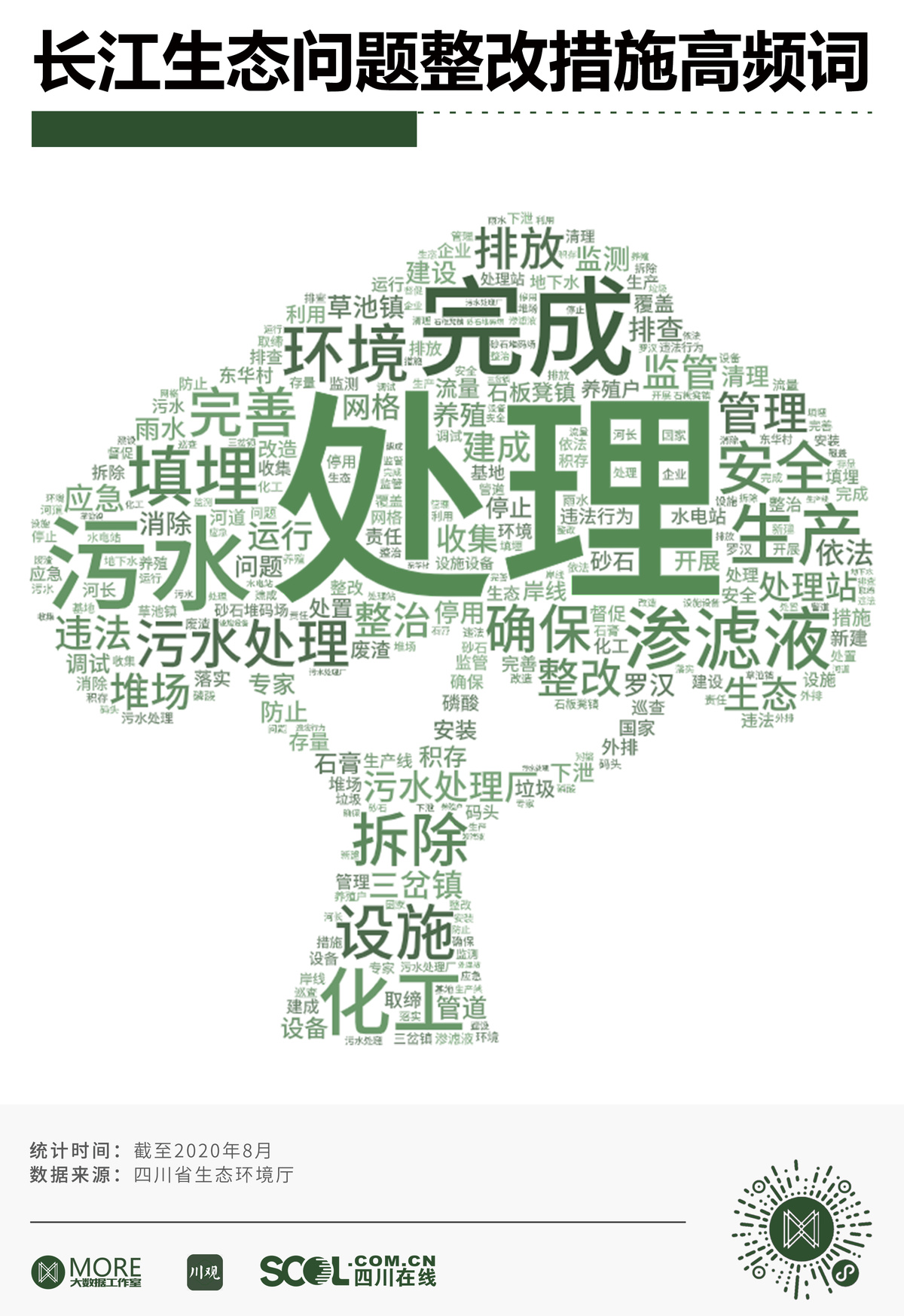 根据四川省生态环境厅发布的内容,对长江生态问题整改公告中的高频词进行统计后发现,出现频率最高的十个词语分别为:处理、完成、渗滤液、污水、污水处理、化工、生产、填埋、环境和污水处理厂。主要涉及污水处理、化工等方面。