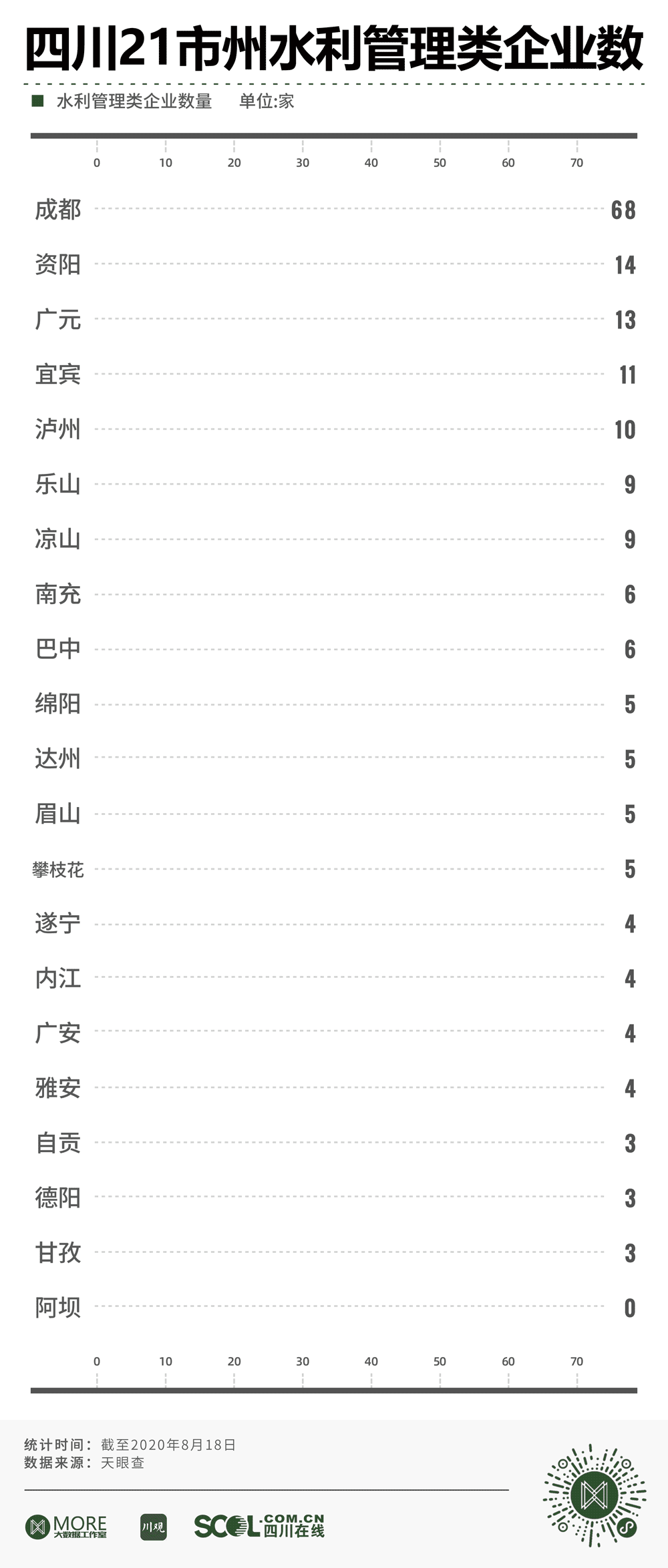 天眼查数据显示,截至2020年8月18日,在四川21市州水利管理类企业数量统计中,成都市位列榜首,共有68家水利管理类企业。资阳、广元、宜宾、泸州分列第2-5位。此外,阿坝州没有相关企业。