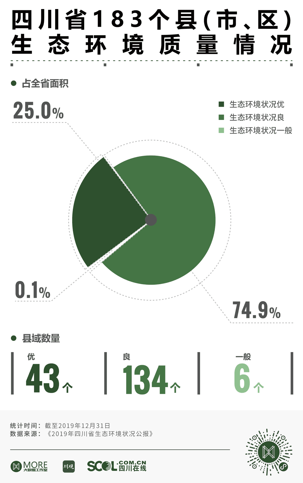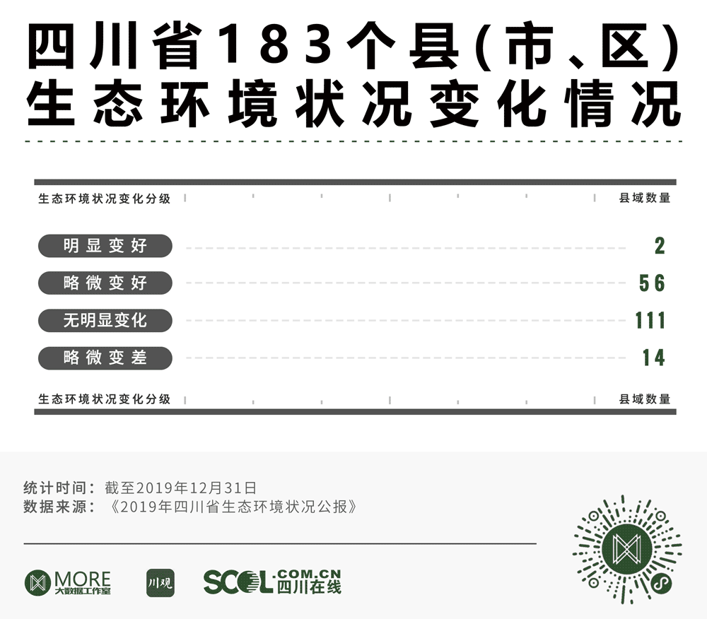 《2019年四川省生态环境状况公报》数据显示,截至2019年12月31日,四川省183个县(市、区)生态环境状况多为优和良,其中评级为“优”的县(市、区)有43个,评级为“良”的有143个。此外,生态环境状况变化分级数据显示,有58个县(市、区)的生态环境相比2018年有所改善,另有14个县域呈现出“略微变差”的趋势。