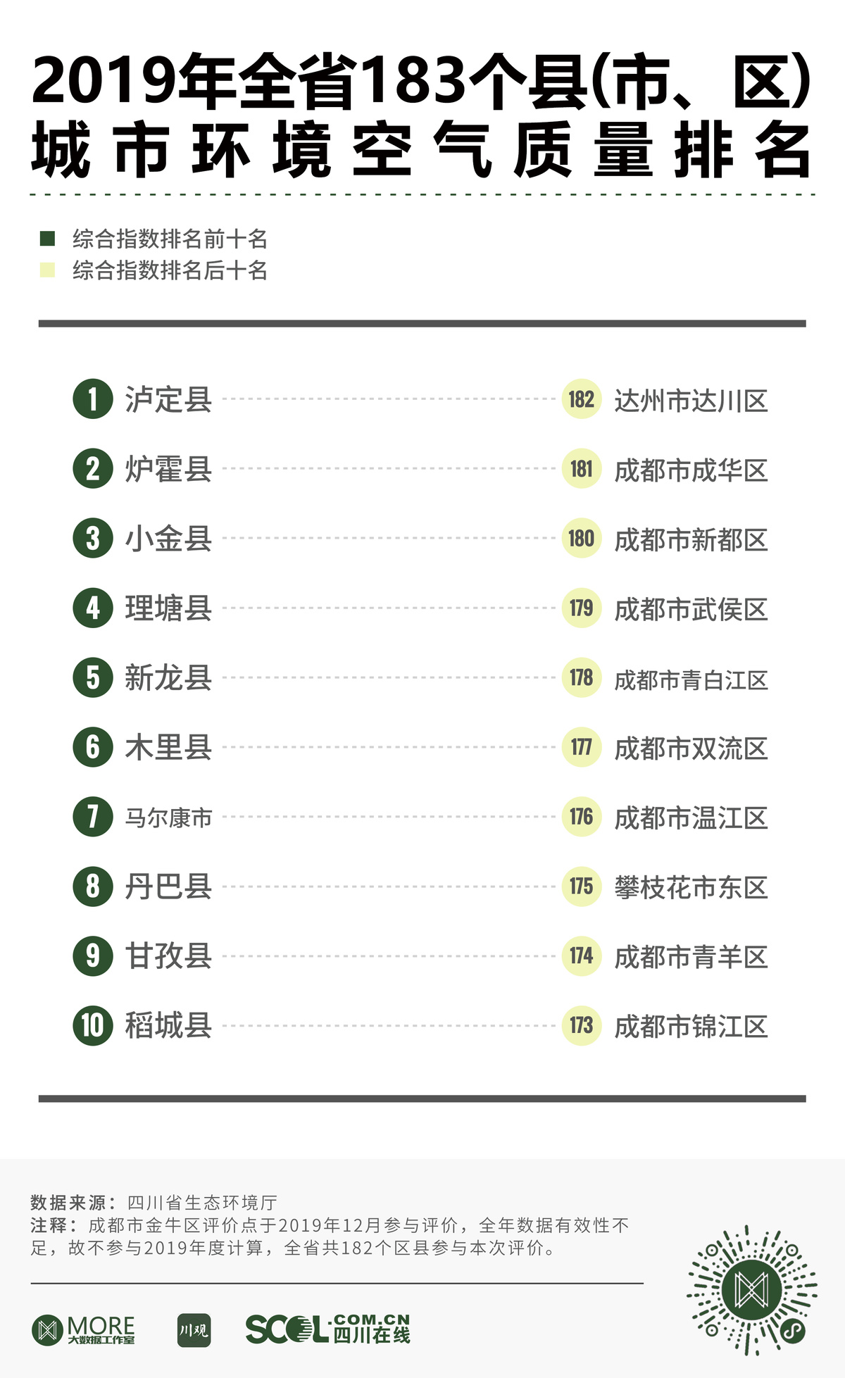 根据四川省生态环境厅发布的公告,2019年全省183个县(市、区)城市环境空气质量综合指数排名中,甘孜泸定县荣登榜首,甘孜炉霍县、阿坝小金县紧随其后。分析各区县的空气质量排名情况,不难发现空气质量排名较后的地区,大多都是工业化水平高或经济发展较好的区县,成都市辖区普遍排名靠后。