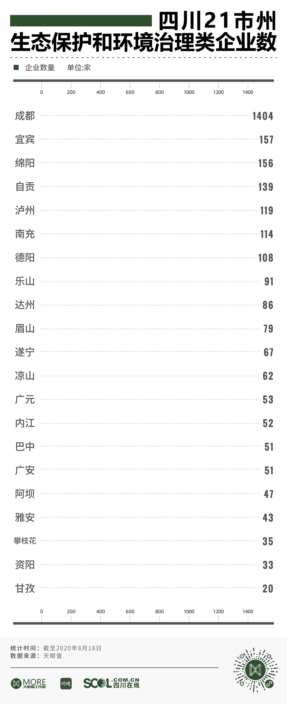 在四川21市州生态保护和环境治理类企业数量统计中,成都市以1404家企业稳居第一,其次是宜宾和绵阳,分别保有150余家生态环境类企业。自贡、泸州、南充和德阳均有一百余家相关企业。