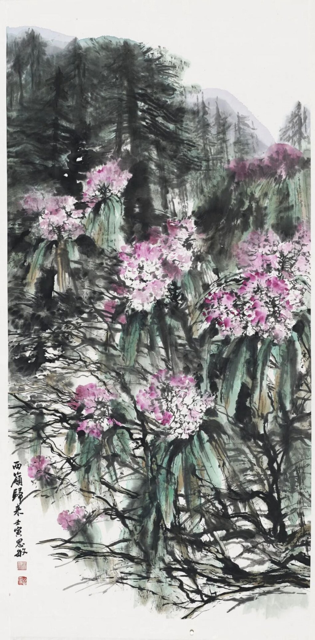 姚思敏的工笔花鸟画打破了传统山水与花鸟、工笔与意笔的界限,通过水墨与色彩相结合,兼施撞水、撞彩等技法,形成自己独有的风格。《西岭归来》中,密林参天,春意遒劲。画卷前方的山花热烈,线、点、皴细密而老辣苍劲,穿插在花林中的黑色枝干不仅增强了花海的繁茂之感,也使得山花少了娇柔之态,在姿态各异、顾盼生辉中生出一股强劲的气势。整个画面酣畅淋漓,浑厚华滋,在细节的丰富与造型上生动鲜活,达到形象、色彩和光感相得益彰的笔墨情趣。