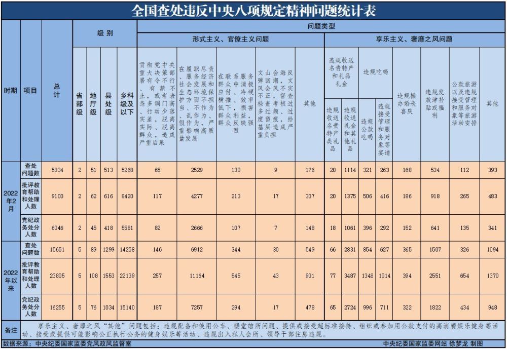 今年2月,全国共查处违反中央八项规定精神问题5834起,批评教育帮助和处理9100人,其中,党纪政务处分6046人。