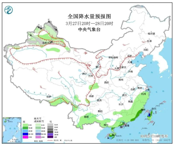中央气象台预计,27日20时至28日20时,新疆北疆大部和南疆西部山区等地部分地区有小到中雪或雨夹雪,其中,新疆北疆高海拔山区局地有大雪。福建东南部、广东南部沿海、海南岛、台湾岛等地部分地区有中到大雨,其中,台湾岛中部、海南岛南部等地局地有暴雨,并伴有短时强降水、雷暴大风、冰雹等强对流天气。