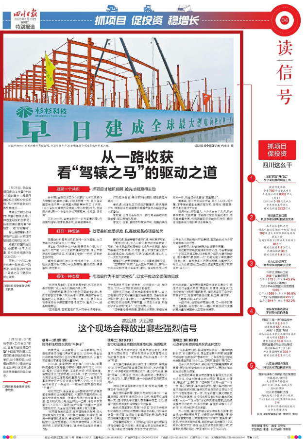 去年底,省委经济工作会议把扩大有效投资作为稳增长的重中之重;今年上班第一天,四川在全国率先组织第一季度重大项目集中开工;1月底,《四川省抓项目促投资稳增长若干政策》印发;全国两会后,第一个全省性会议再度聚焦“抓项目、促投资”。