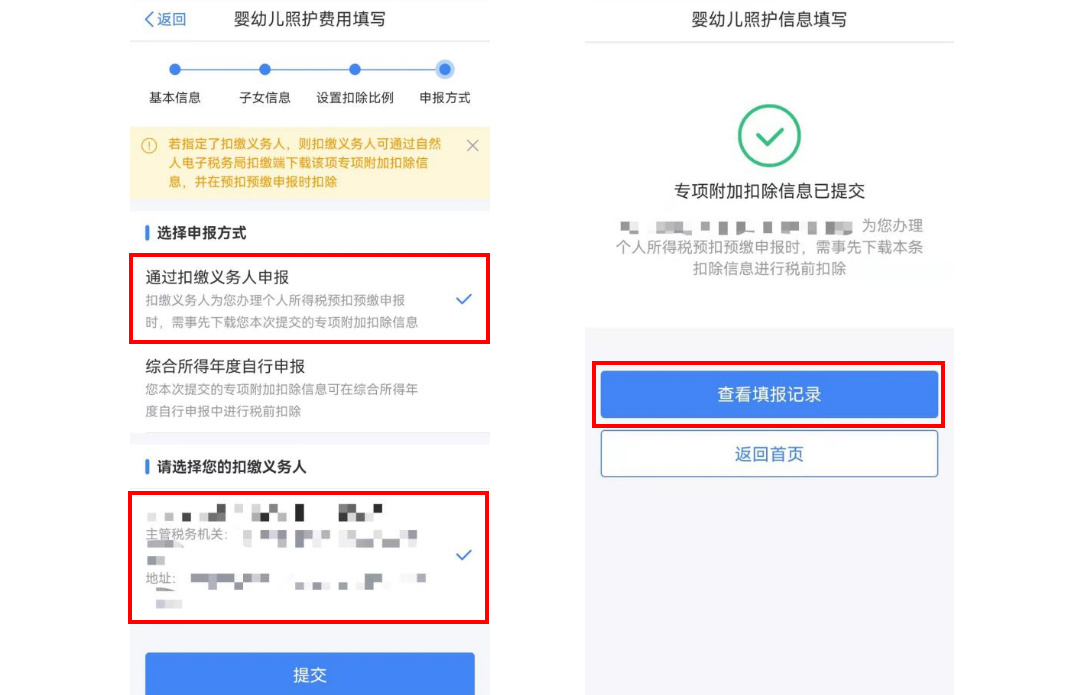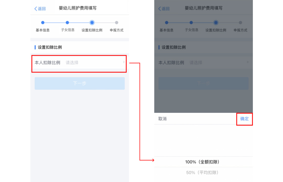 第四步,完成子女信息填写后,纳税人可自主选择本人扣除比例。按照规定,父母可以选择由其中一方按扣除标准的100%扣除,也可以选择由双方分别按扣除标准的50%扣除,具体扣除方式在一个纳税年度内不能变更。