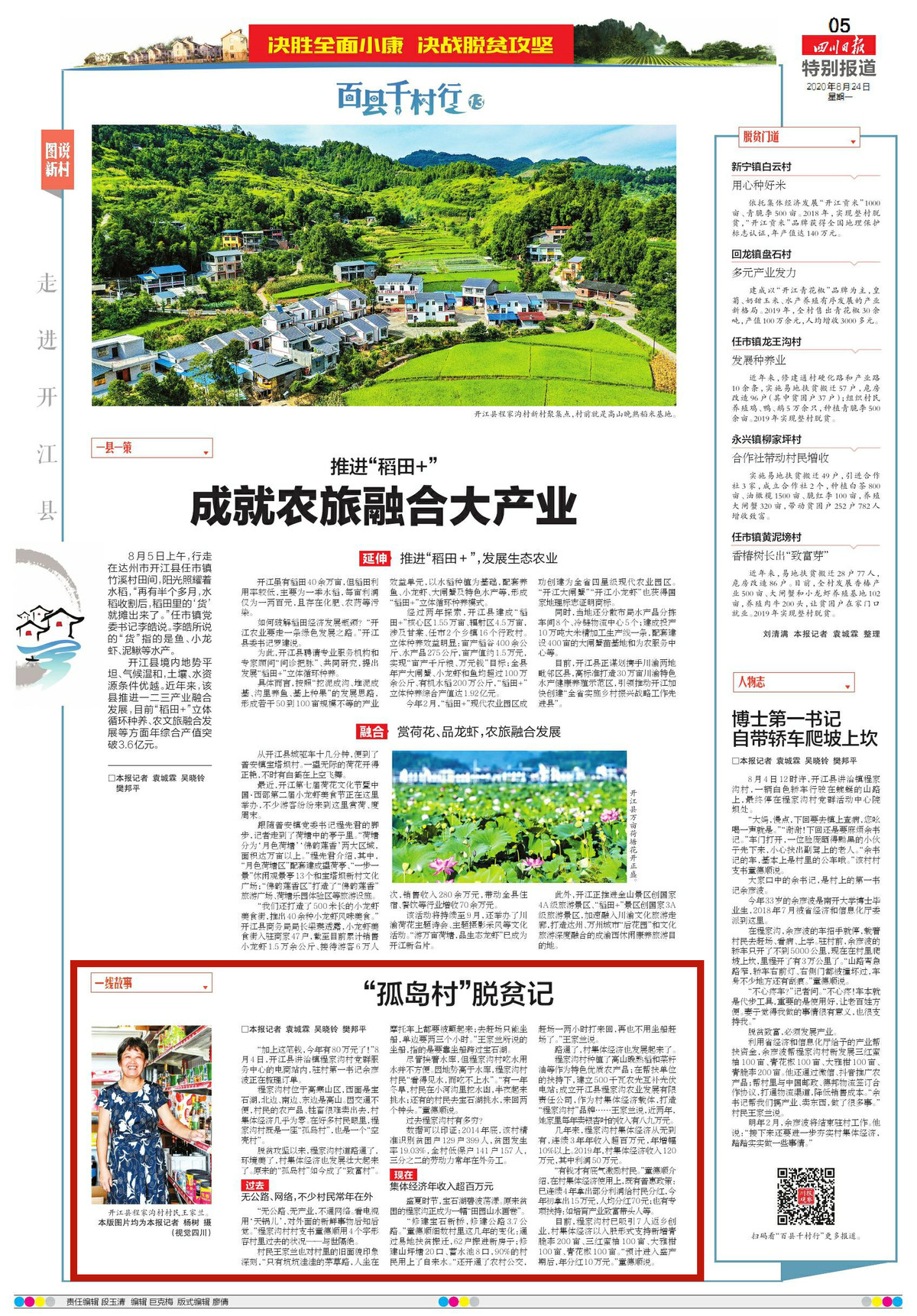 路通了,村集体经济也发展起来了。程家沟村种植了高山晚熟稻和菜籽油等作为特色优质农产品;在帮扶单位的扶持下,建立500千瓦农光互补光伏电站;成立开江县程家沟农业发展有限责任公司,作为村集体经济载体,打造“程家沟村”品牌……王家兰说,近两年,她家里每年卖银杏叶的收入有八九万元。