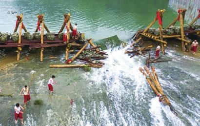 “放水喽!”伴随着一声高亢的号子,拦水杩槎被人们齐力拉倒,奔腾的江水倾泻而下,流向广袤的成都平原。