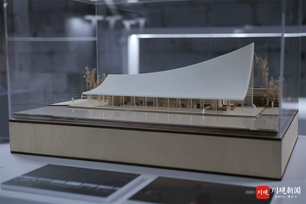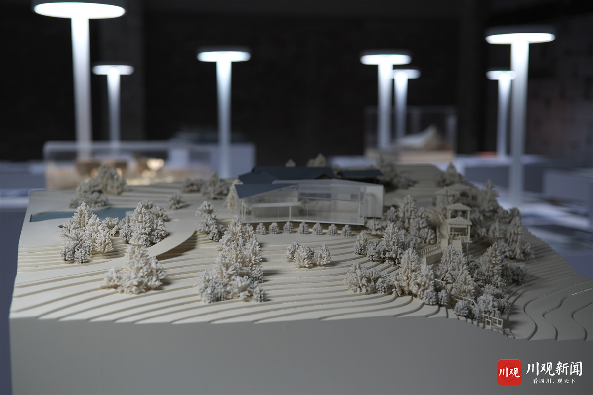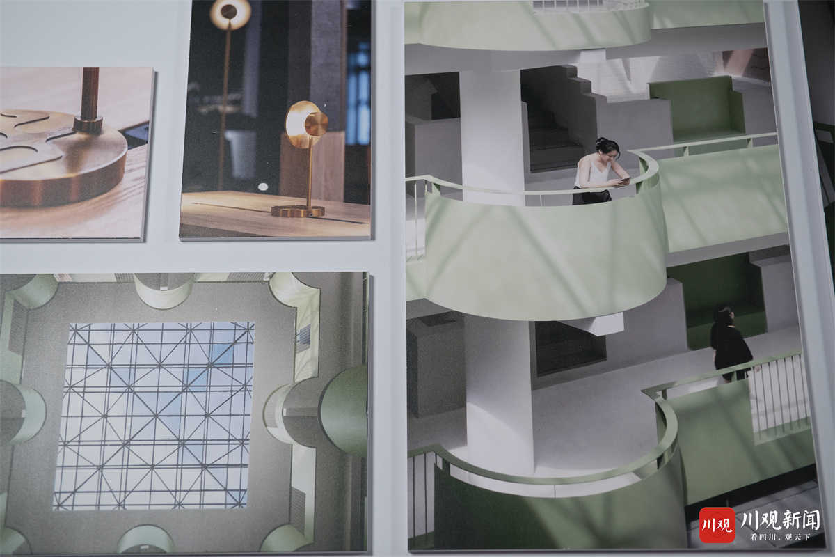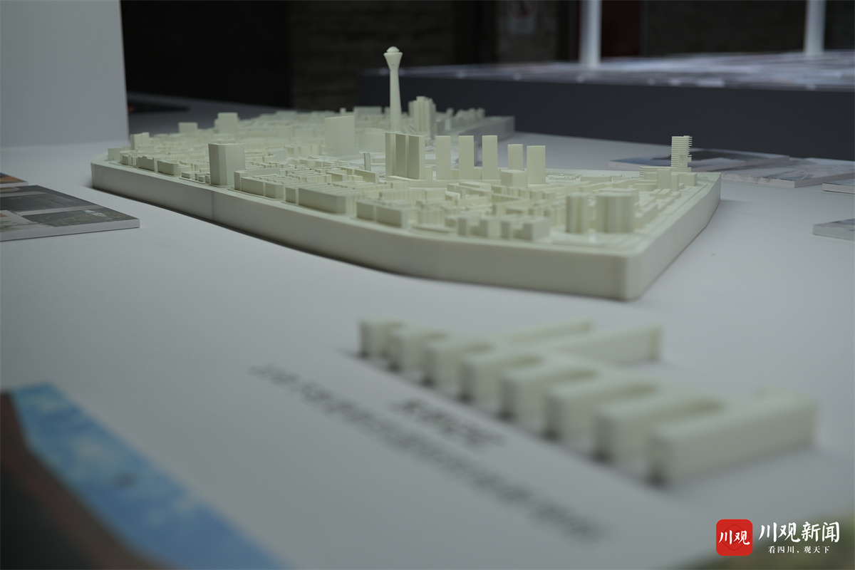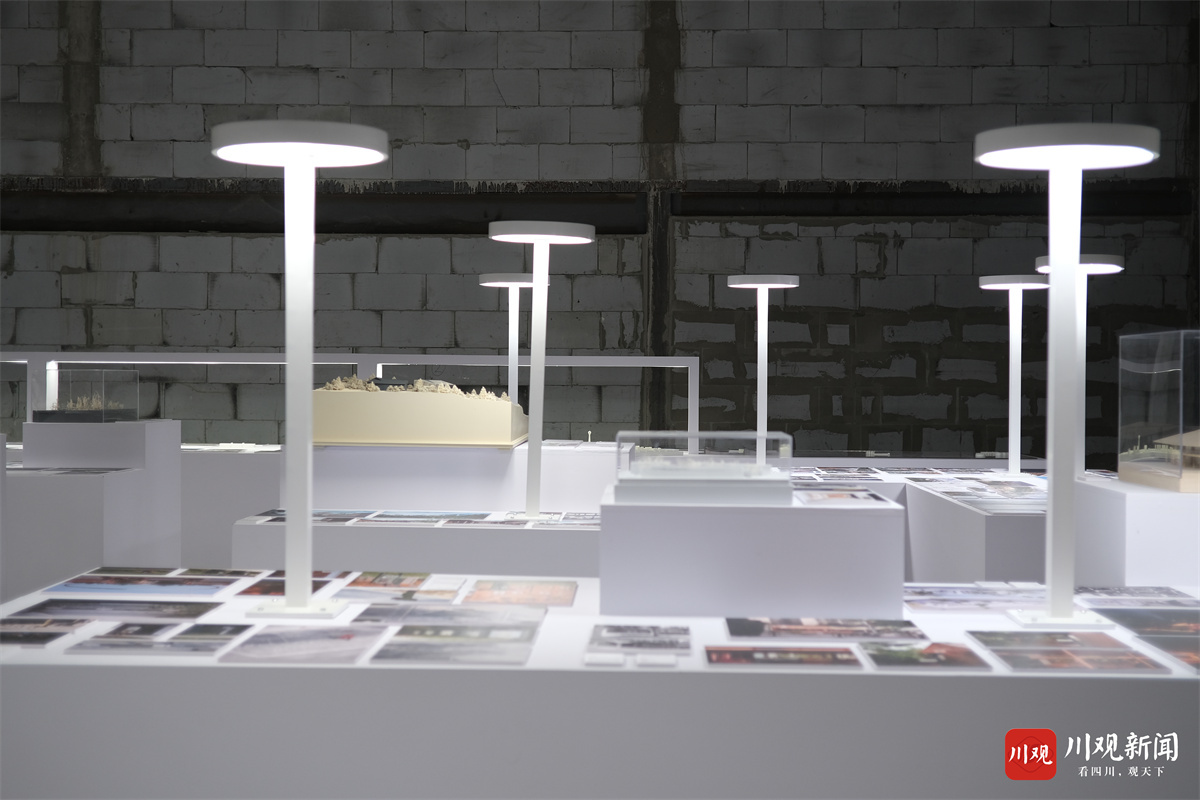 在“老仓库”展场内,一根根直立的光柱照亮每一个展台,展品放置于类似于建筑设计师工作案台的白色展台上,简洁明快。策展人余明旻告诉川观新闻记者,这是契合展览主题“光合”的一个艺术化表达设置,意在表达城市更新的有序推进靠的是合众之力,特别是众多优秀建筑设计事务所的深度参与。