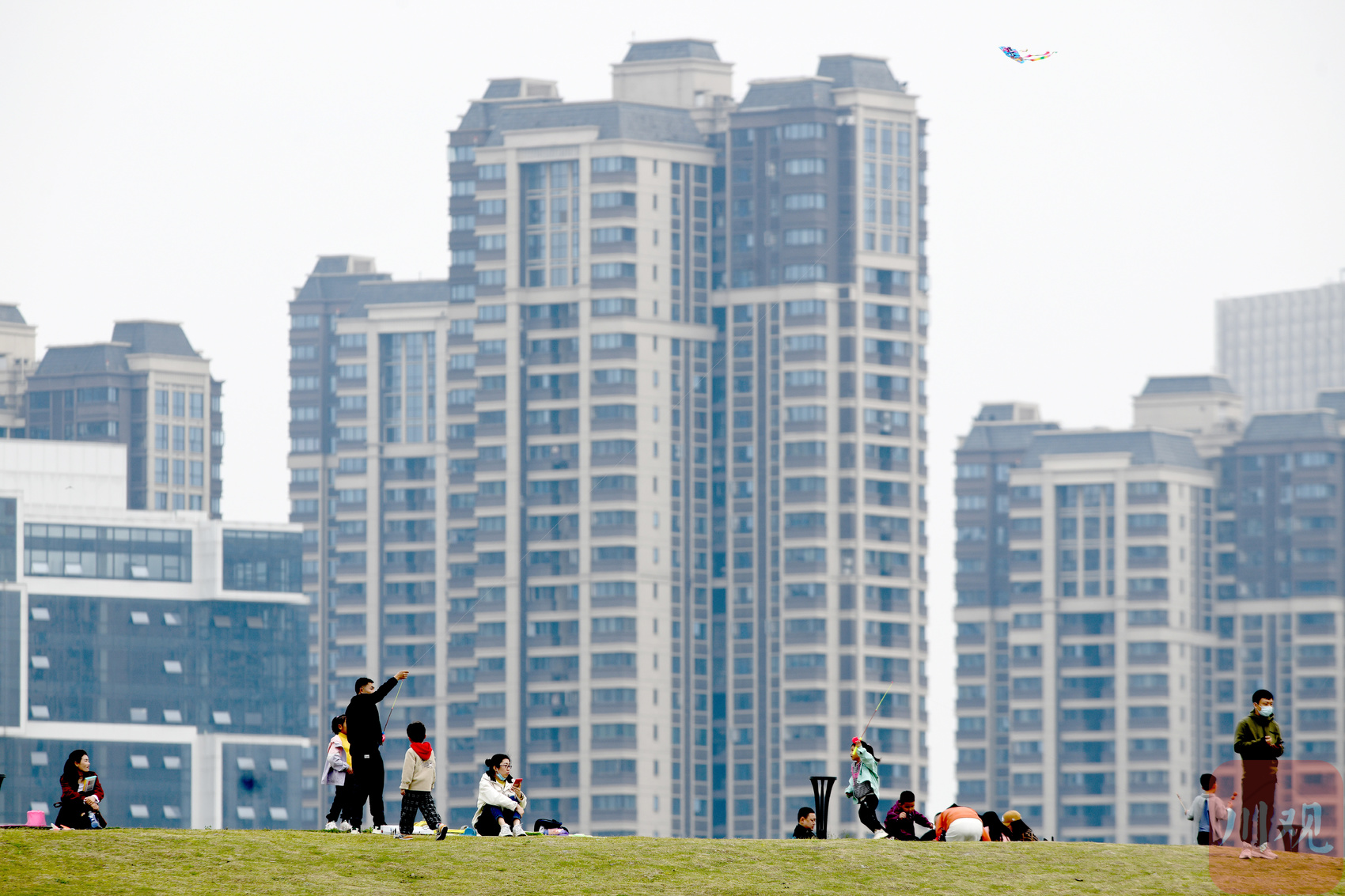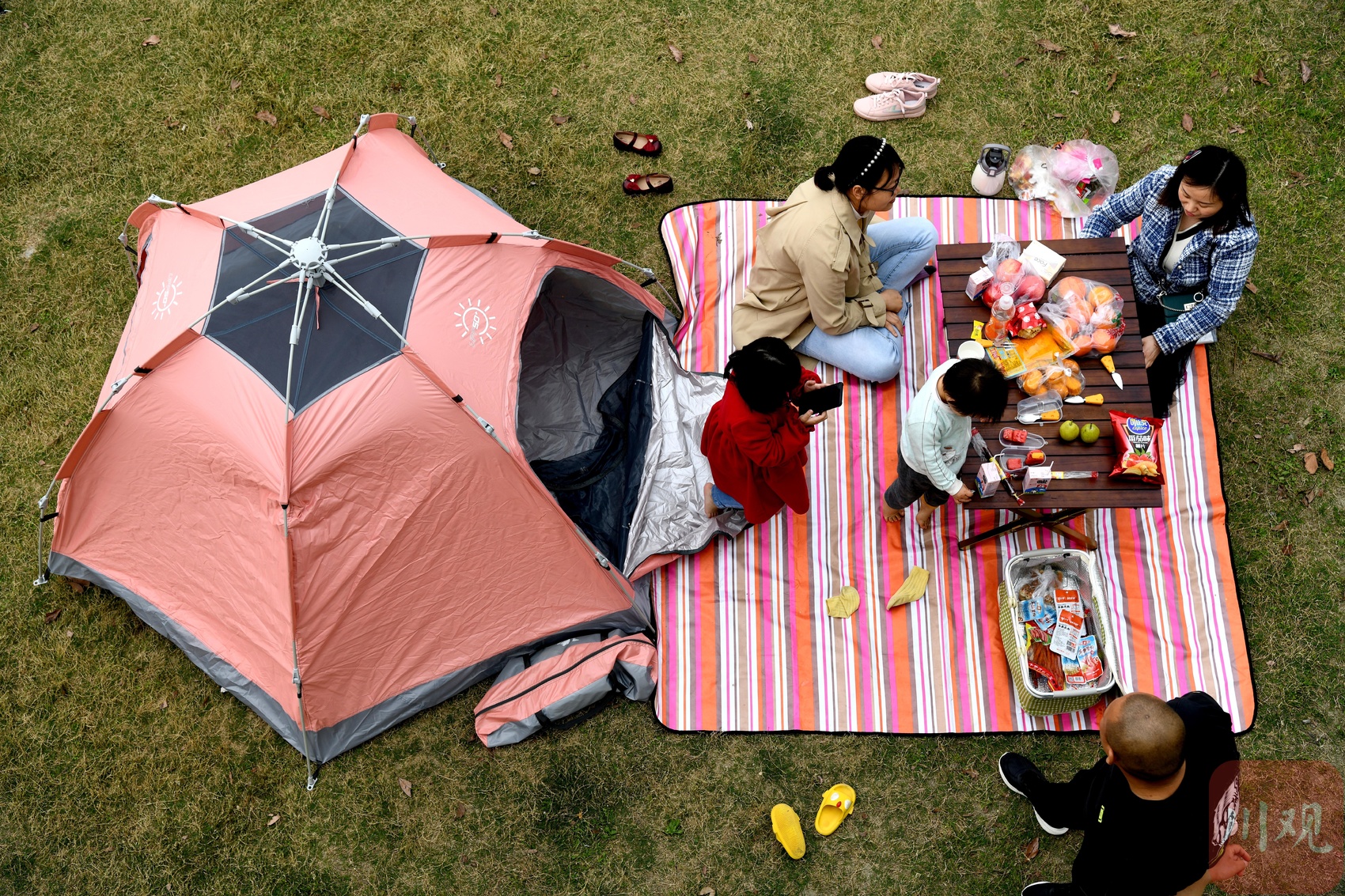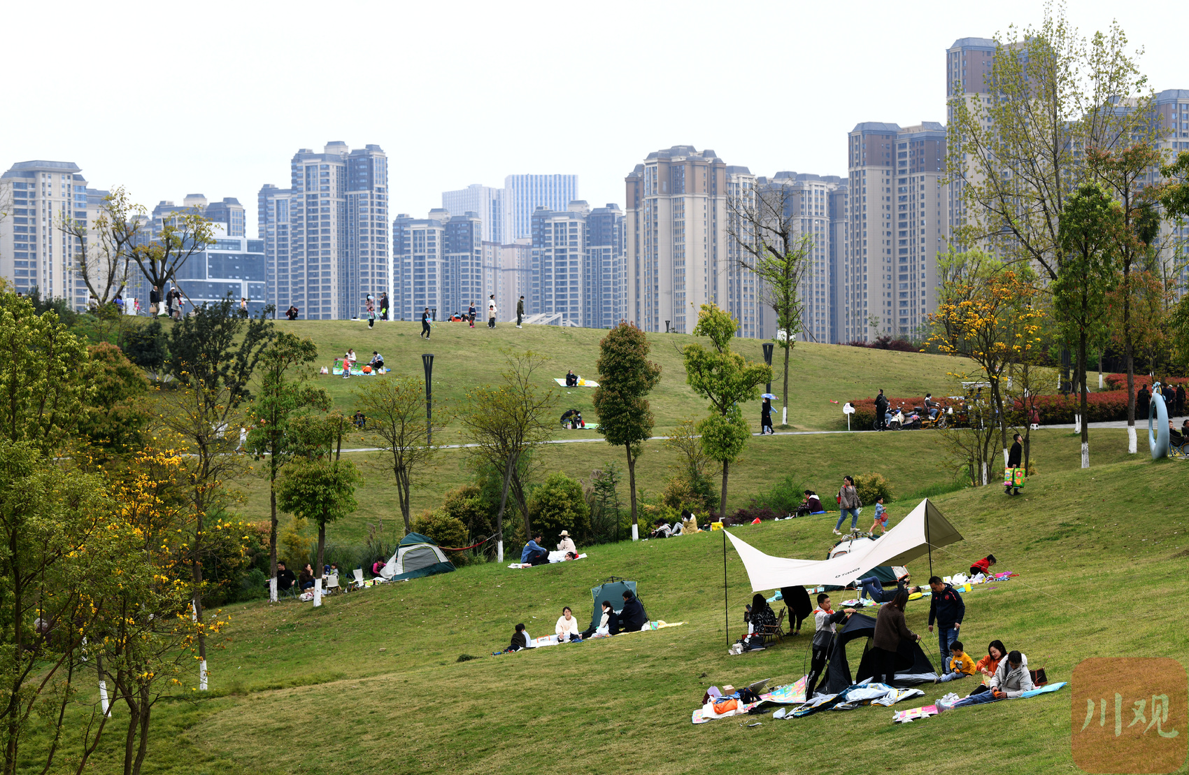 远处,绿色覆盖的缓坡草地上露营的各式帐篷洒落其间,视野内的一幢幢民宅高楼融合在周围的景致中,颇为和谐。