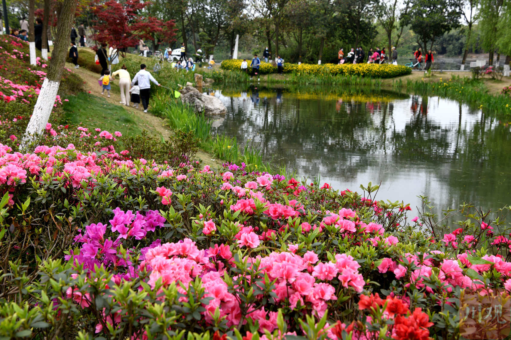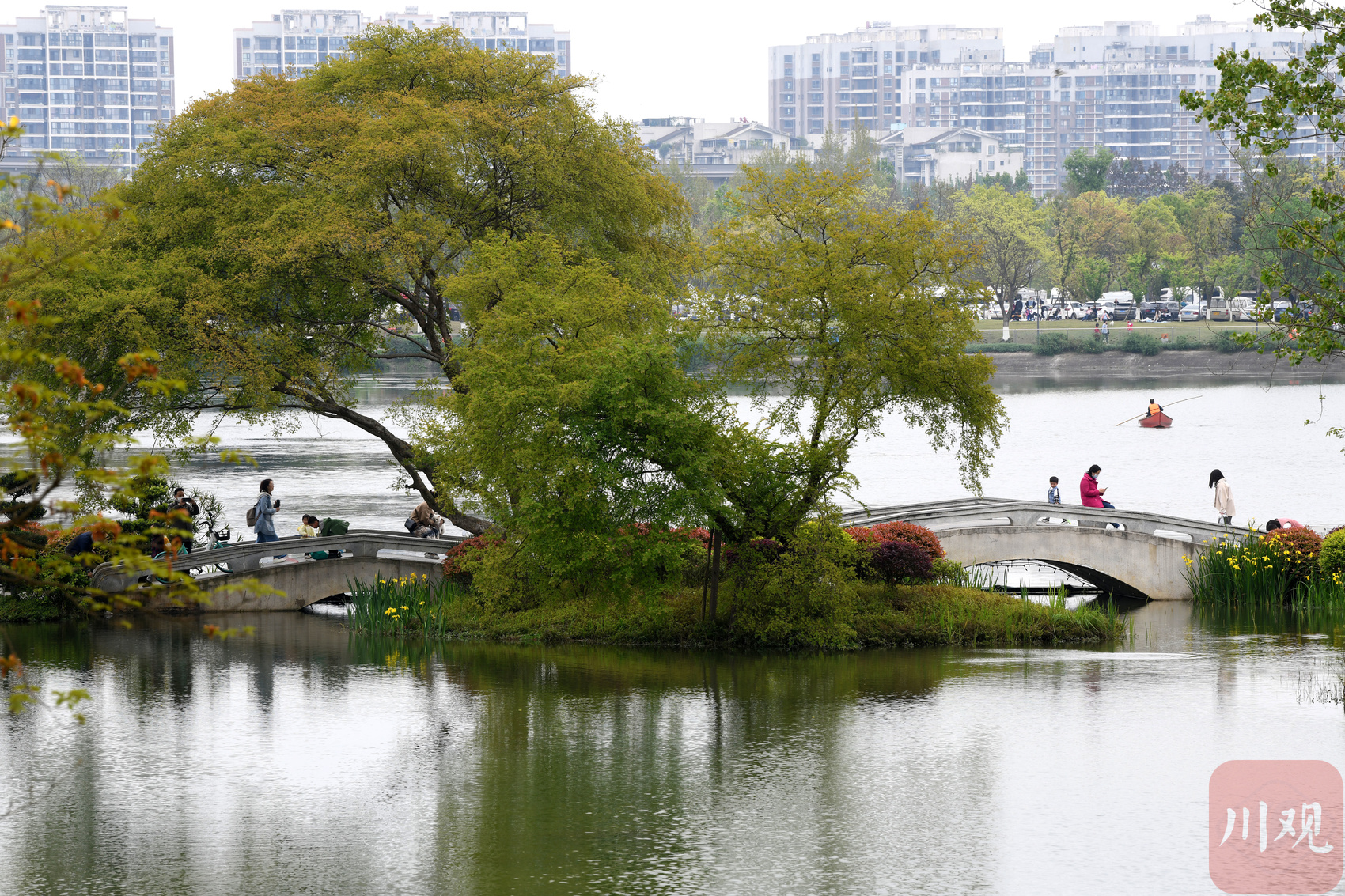 4月3日,成都北门的北湖生态公园,沿岸的杨柳树早已新绿浸染,随风摇曳的榆树叶在春光中打滚,鲜亮的黄风铃木和粉白、粉红的海棠花以及湿地里水嫩色彩的黄菖蒲都显得婀娜多姿。