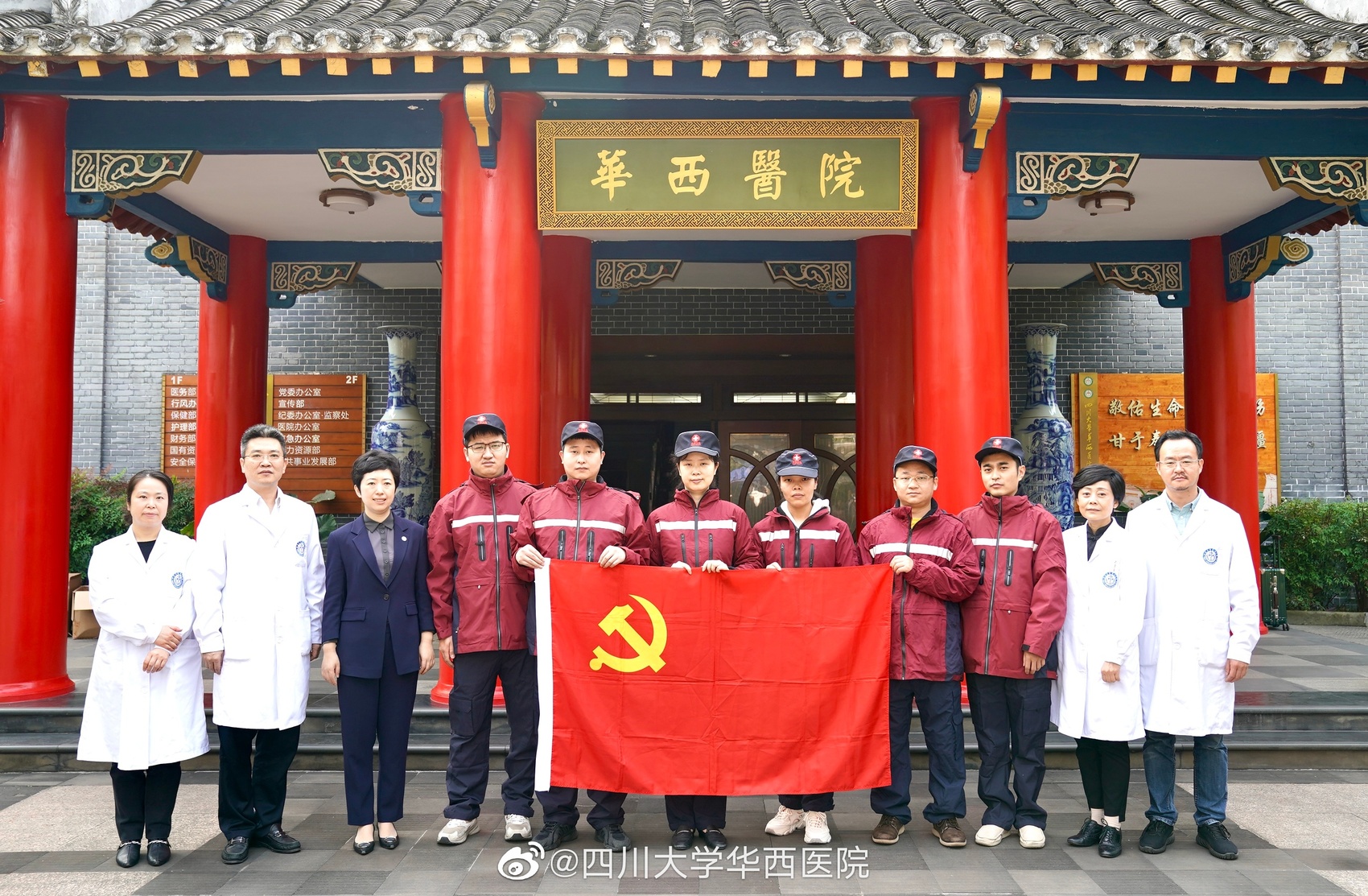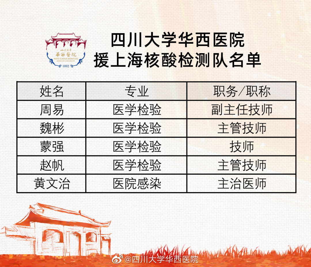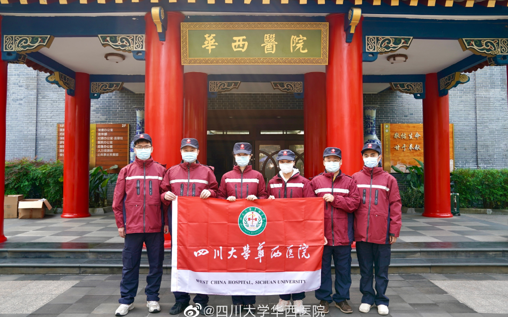 4月3日,四川大学华西医院的5名医务工作者随四川援沪医疗队乘包机抵达上海。此次华西援沪小分队队长为周易,队员为魏彬、蒙强、赵帆、黄文治。据了解,我院队员们抵达上海后,主要在方舱检测点开展核酸采样、检测等相关工作。为他们加油!祝早日平安归来!