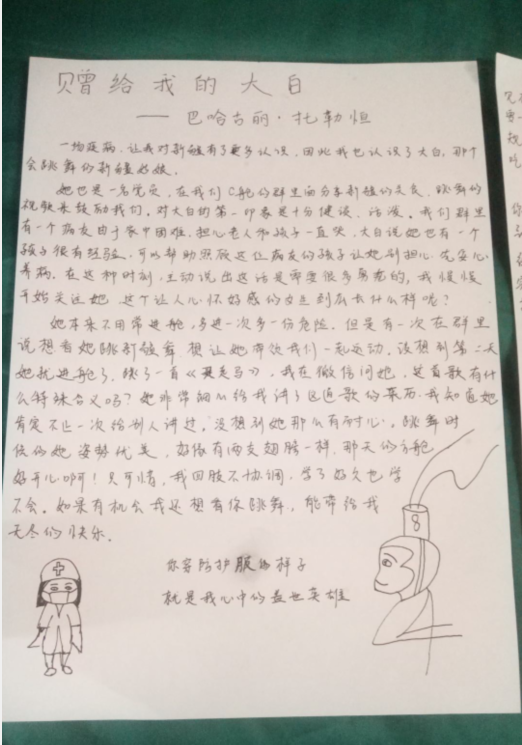 “大家好!我是在方舱医院里面带领患者跳新疆舞的‘大白’——巴哈古丽·托勒恒。非常感谢中国生命关怀协会医院人文建设专委会的关心和关怀。我们现在依然在一线继续战斗,我们都很好,我坚信一切都会好起来,请大家继续为我们加油鼓劲。祝大会圆满成功举办!祝大家一切顺利!”