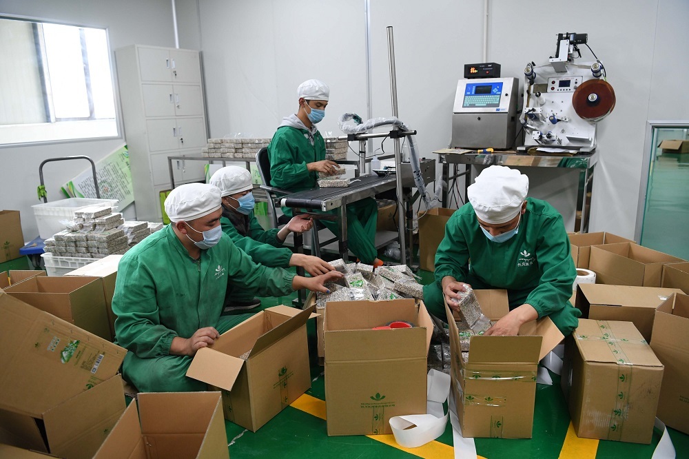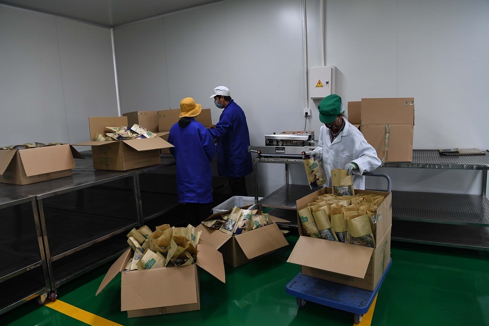 阿坝县高原黑青稞天然生物开发有限公司内,工人在生产车间包装黑青稞饼。