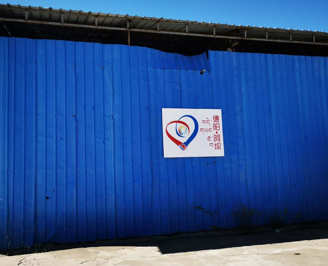 一只蓝色的手紧握一只红色的手,两手相偎相交,组成一个心型,图旁四个大字“德阳.阿坝”。在阿坝县看见这个图,就意味着,看到了德阳援建阿坝的项目。